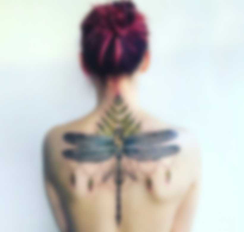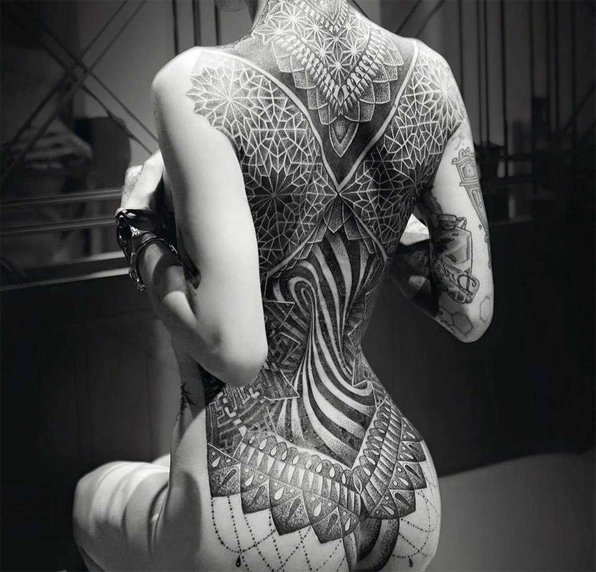 Мастера считают спину идеальным местом для работы в стиле дотворк, а многомерность даже небольших картинок между лопаток заиграет неповторимой красотой благодаря технике точечного исполнения. Для более масштабных идей актуален реализм. Портреты, птицы, насекомые или животные, набитые в этом стиле, создают оригинальный эффект объемности. Мрачность блэкворка больше подходит мужчинам, но правильный выбор эскиза для девушки сделает графику элегантной.