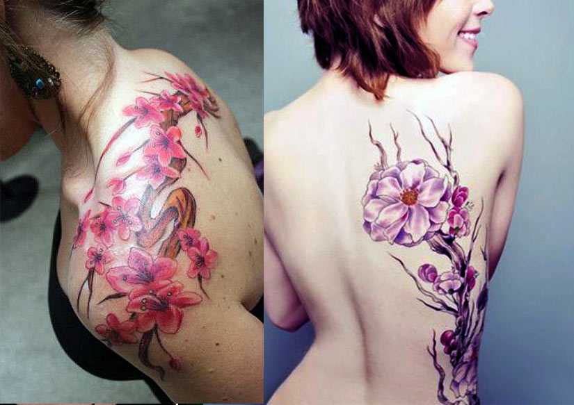 Татуировка цветов. Данная тематика является одной из самых востребованных среди лиц женского пола. Чаще всего можно наблюдать определенный вид цветка на всю спину либо вдоль позвоночника, который в этом случае напоминает чем-то стебель. Лучше всего наносить данный элемент акварельным стилем, так как у мастеров получается добиться непревзойденного стиля и эстетичного вида, так можно легко подчеркнуть индивидуальность каждого владельца.