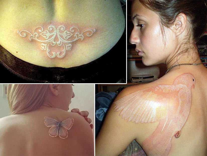 Белая татуировка на спине также пользуется большим спросом у представительниц прекрасного пола, а все потому, что выглядит она невероятно круто, особенно на загорелой коже. Такой рисунок не так заметен, как изображение, нанесённое черной краской.