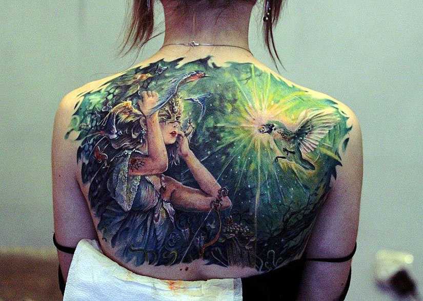 Современные мастера не ограничиваются только синим или черным цветом чернил. Существует большая палитра красок, которая украсит женскую спину. Размер тату может варьироваться от маленькой надписи или элемента до объемного изображения. В данном случае, необходимо основываться на свои личные предпочтения.