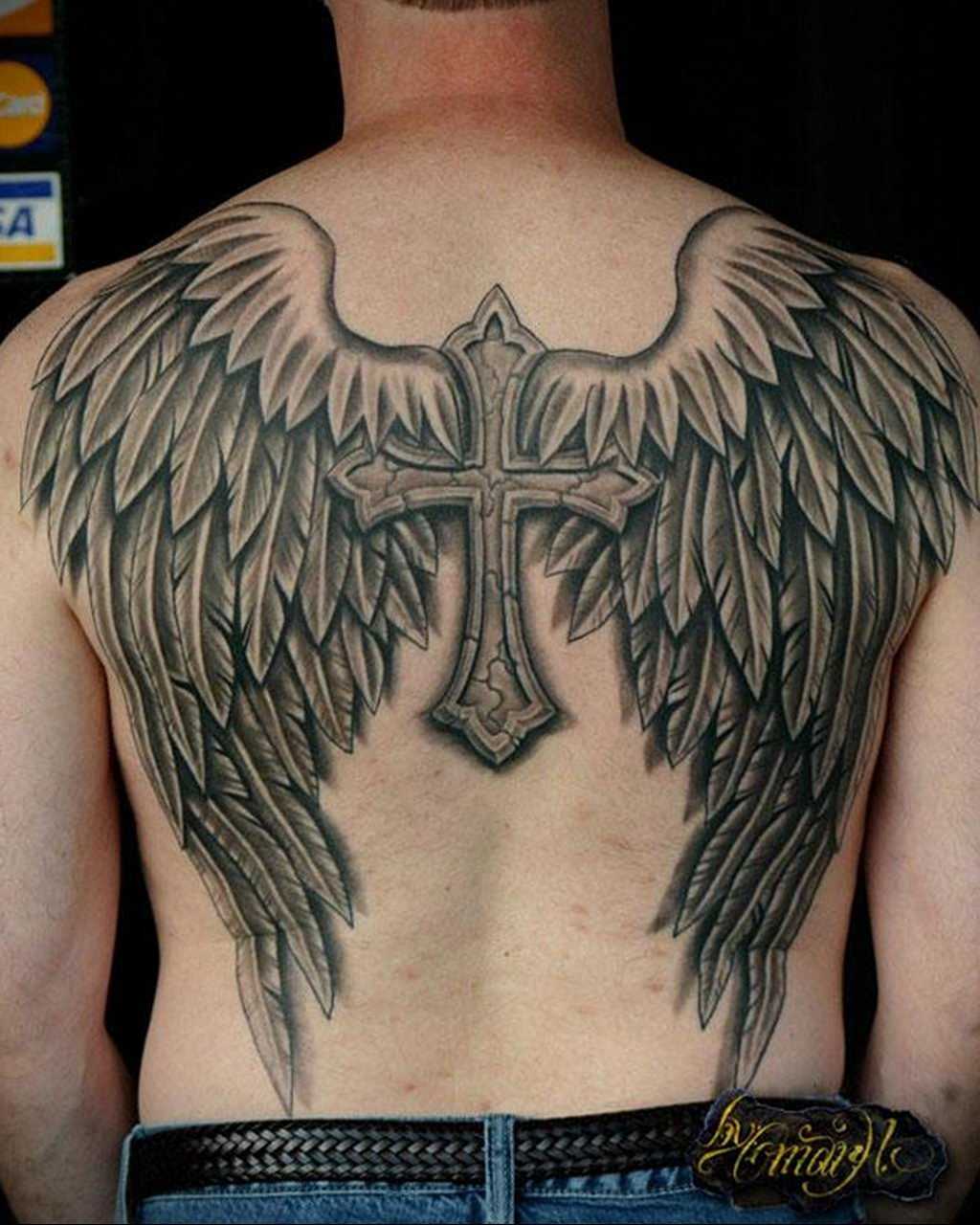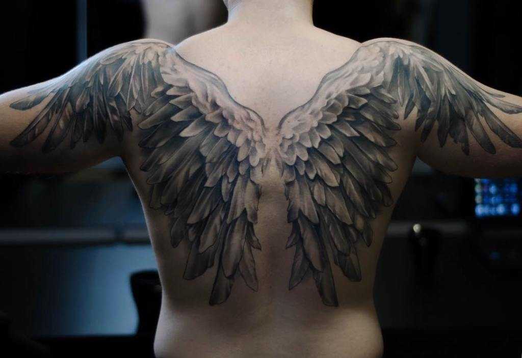 Эскиз крыльев на спине. Зачастую данное изображение можно наблюдать в ангельской форме, это может показывать привязанность человека к определенной религии. Крылья также могут быть выполнены в различном стиле, иметь целый либо рваный вид, какие-то необычные формы, черно-белые или цветные.