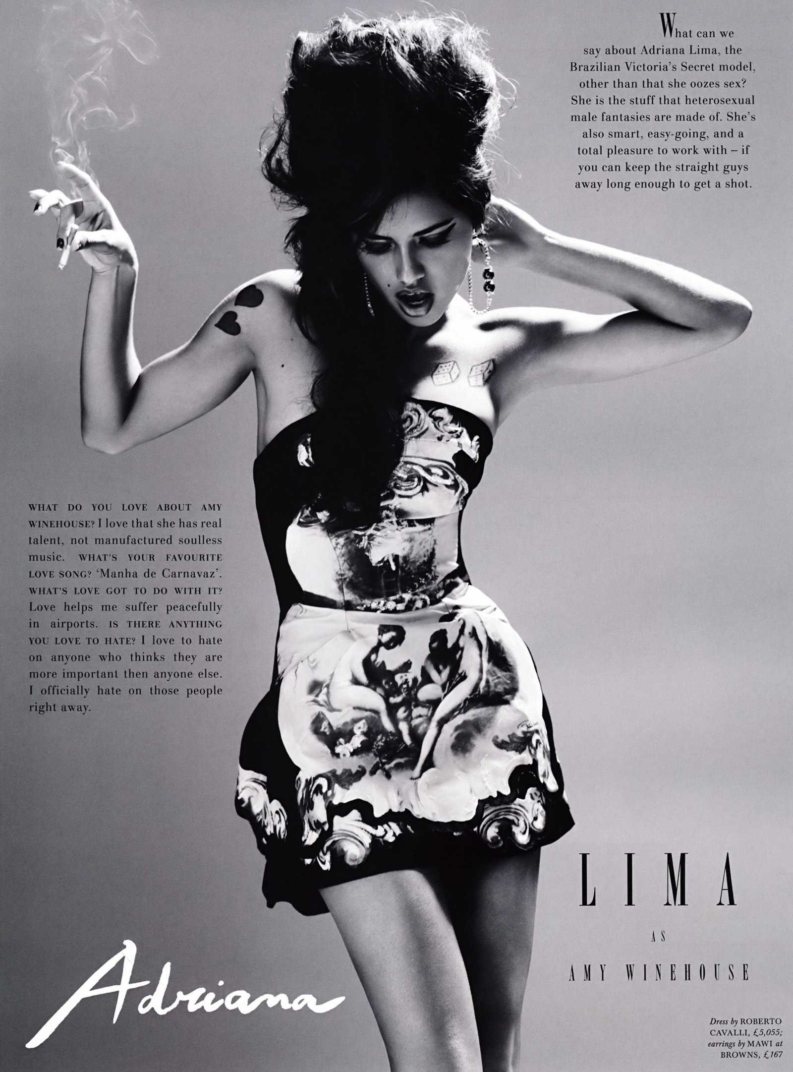 Прилизанный начес и аккуратная подводка не шли ни в какое сравнение со стилем Уайнхаус — ее стрелки всегда были размашистыми, а прическа растрепанной. Намного лучше передать образ Эми получилось у Адрианы Лимы в фотосессии для журнала Love — ретронеопрятность певицы была видна во всем, вплоть до разрозненных переводных татуировок.