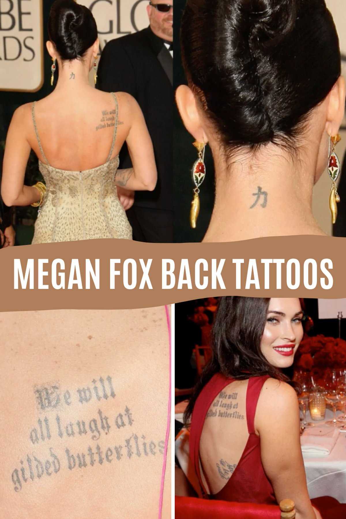 Актриса остается верна своей профессии и постоянно демонстрирует свою творческую натуру в виде татуировок из стихотворных строчек и фраз из литературных произведений. «Мы всегда будем смеяться над золотыми (позолоченными) бабочками», — сказал когда-то над телом любимой дочери король Лир. В оригинале у Шекспира это звучит: «We will all laugh at gilded butterflies». Именно эту фразу вы можете увидеть на спине Меган Фокс, с правой стороны в области лопатки.
