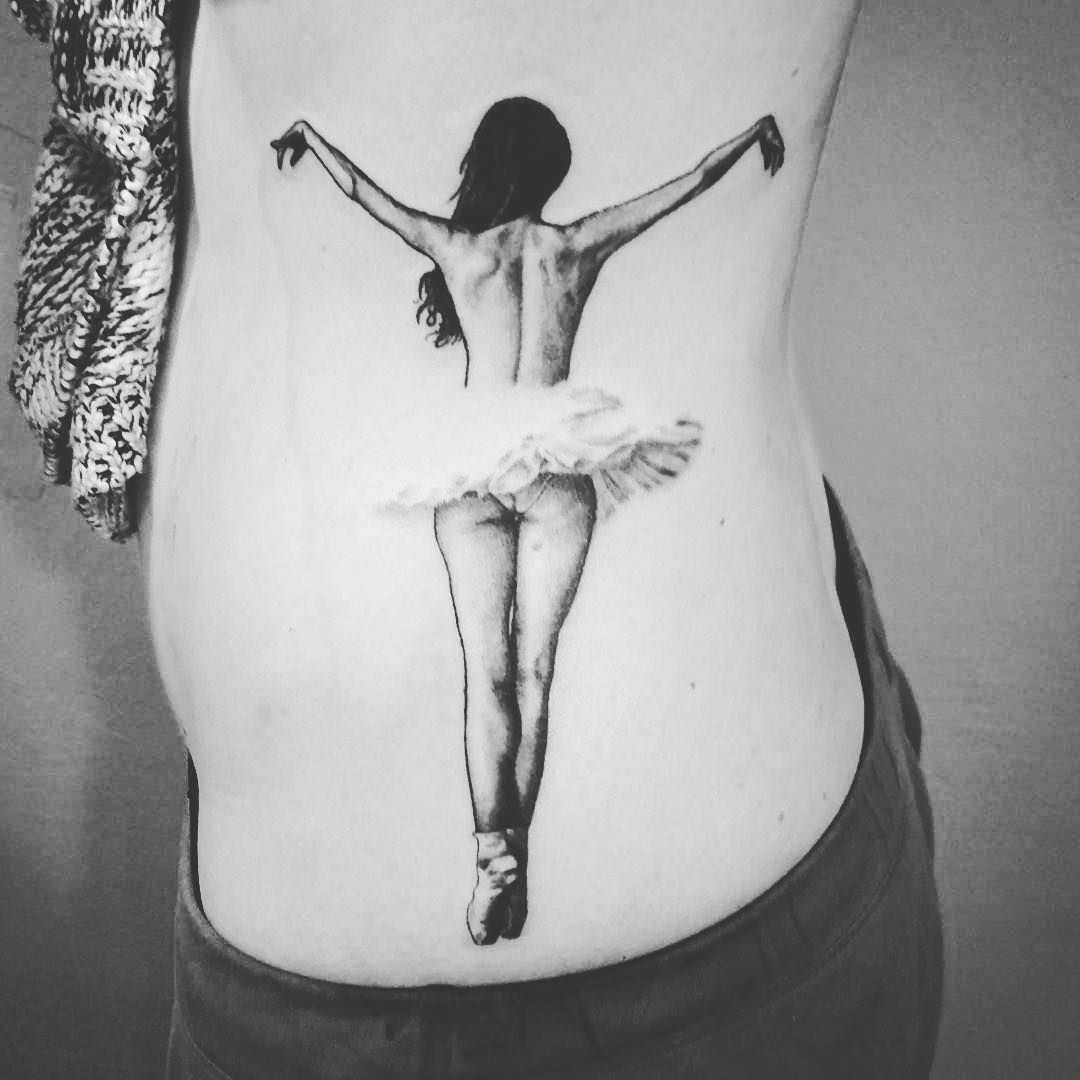 Тату балерины на ноге является одним из распространенных мест размещения рисунка, точно так же, как и тату балерины на руке. Часто рисунок располагается на боку с последующим его переходом на низ живота.