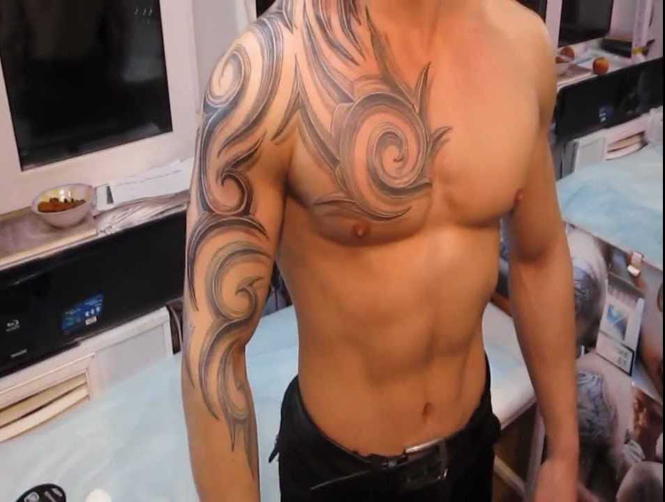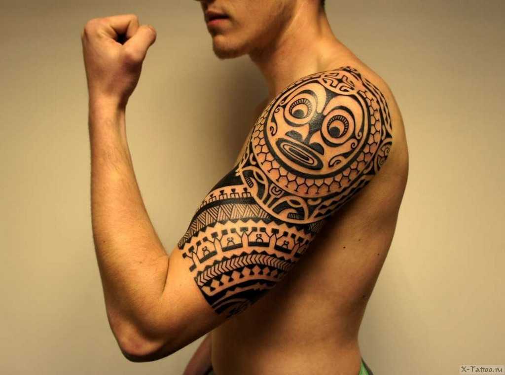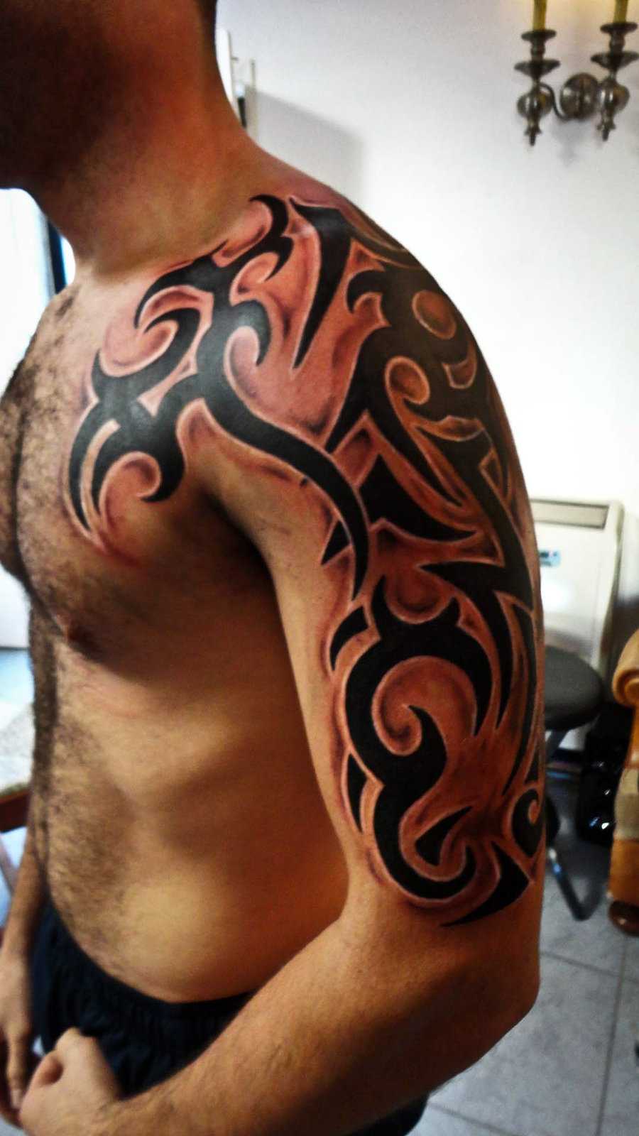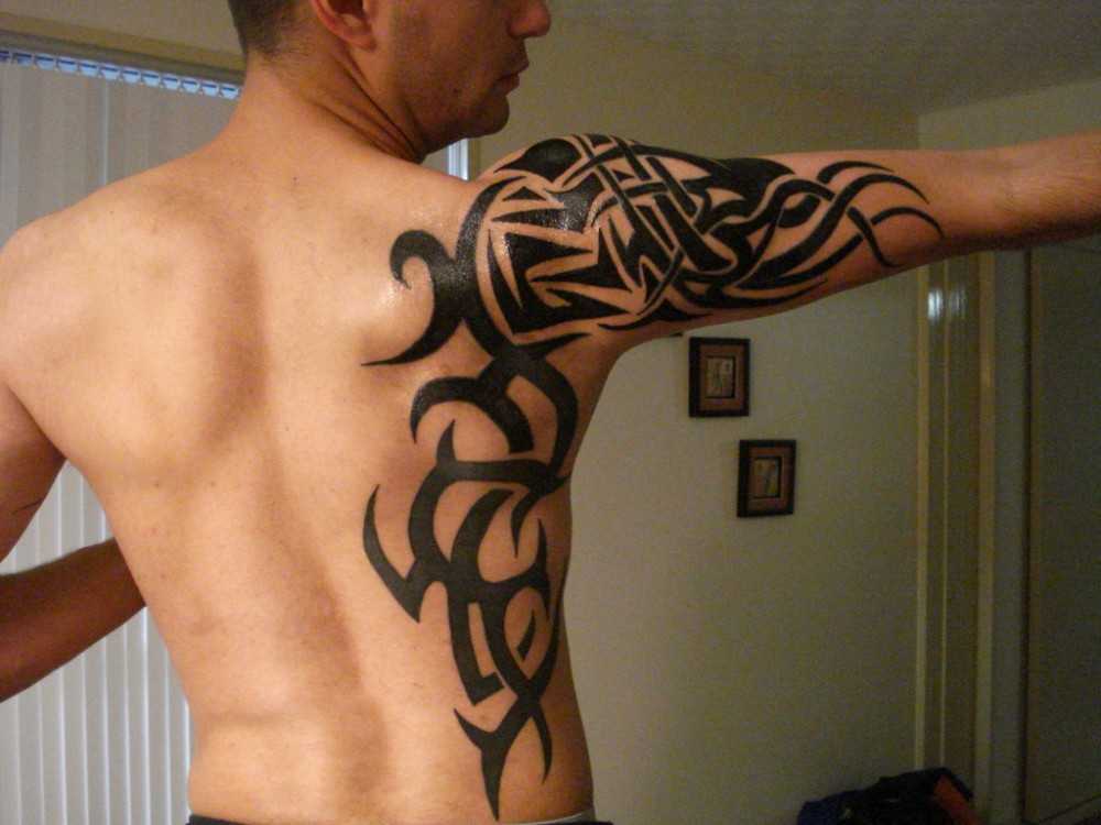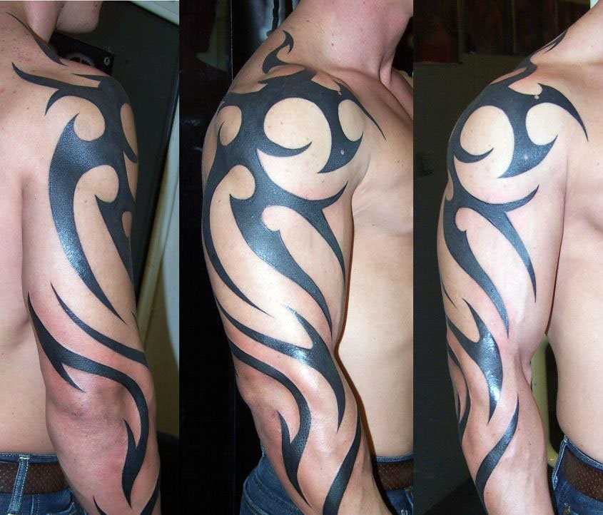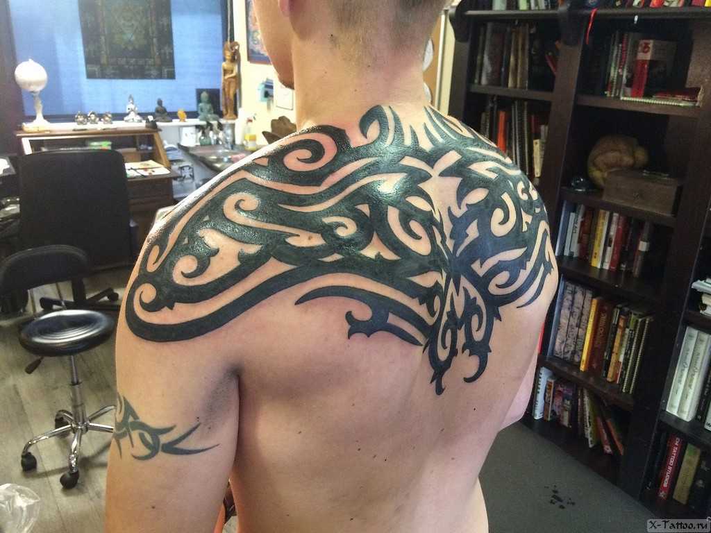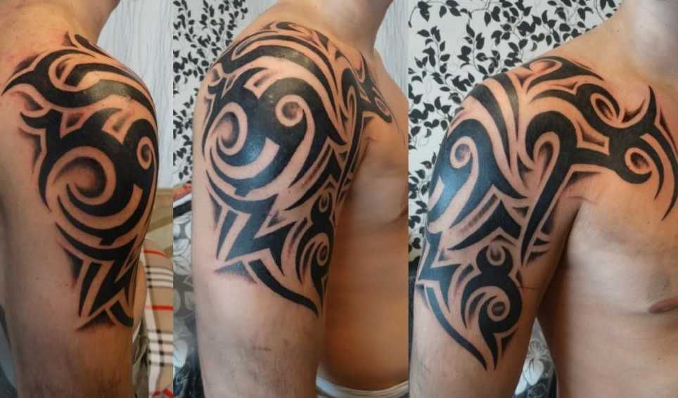 Удачное место для нанесения тату трайбл — плечо. Здесь здорово выглядят абсолютно черные рисунки с эффектом 3D. Крупные формы и толстые линии переплетаются между собой, создавая удивительный узор. Нередко эскиз выполняют совместно с символом Инь-Ян, луной, солнцем, узелками, переплетениями, образами оскаленного тигра, воющего волка, мифического дракона. Дополняют изображение глубокой, яркой тенью, другими оттенками палитры, такими как красный, зеленый, синий, белый.