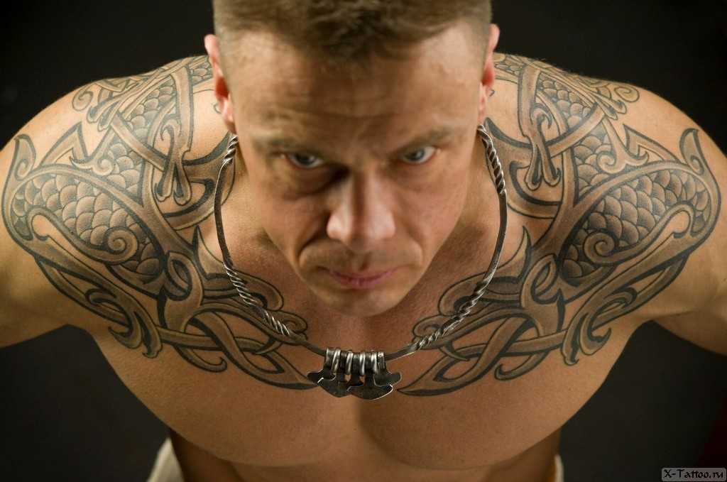 Татуировка трайбл на груди — это, преимущественно, мужской выбор. Здесь отлично располагаются объемные, крупные узоры, выполненные в кельтской, африканской тематике. Великолепно выглядит сочетание уникального орнамента с волком, тигром, скорпионом, драконом, крестом, сердцем, луной и звездами.