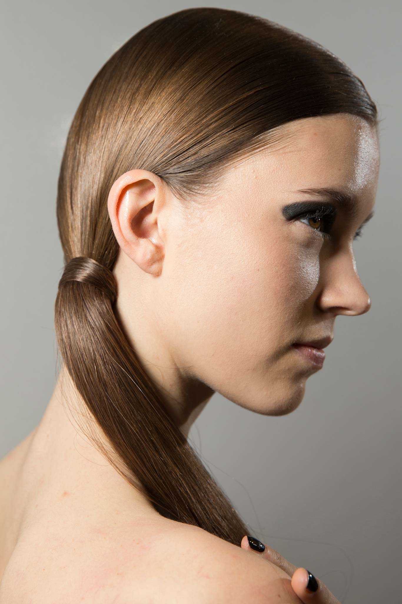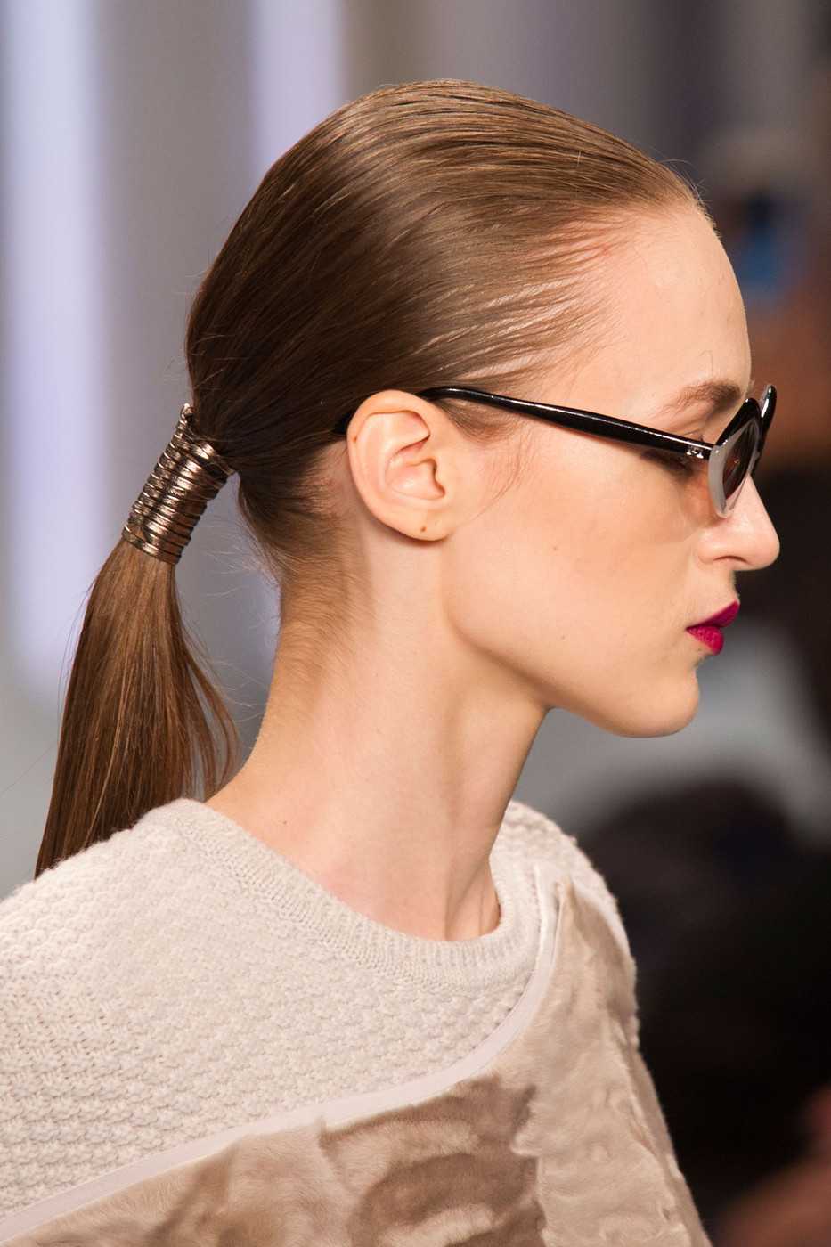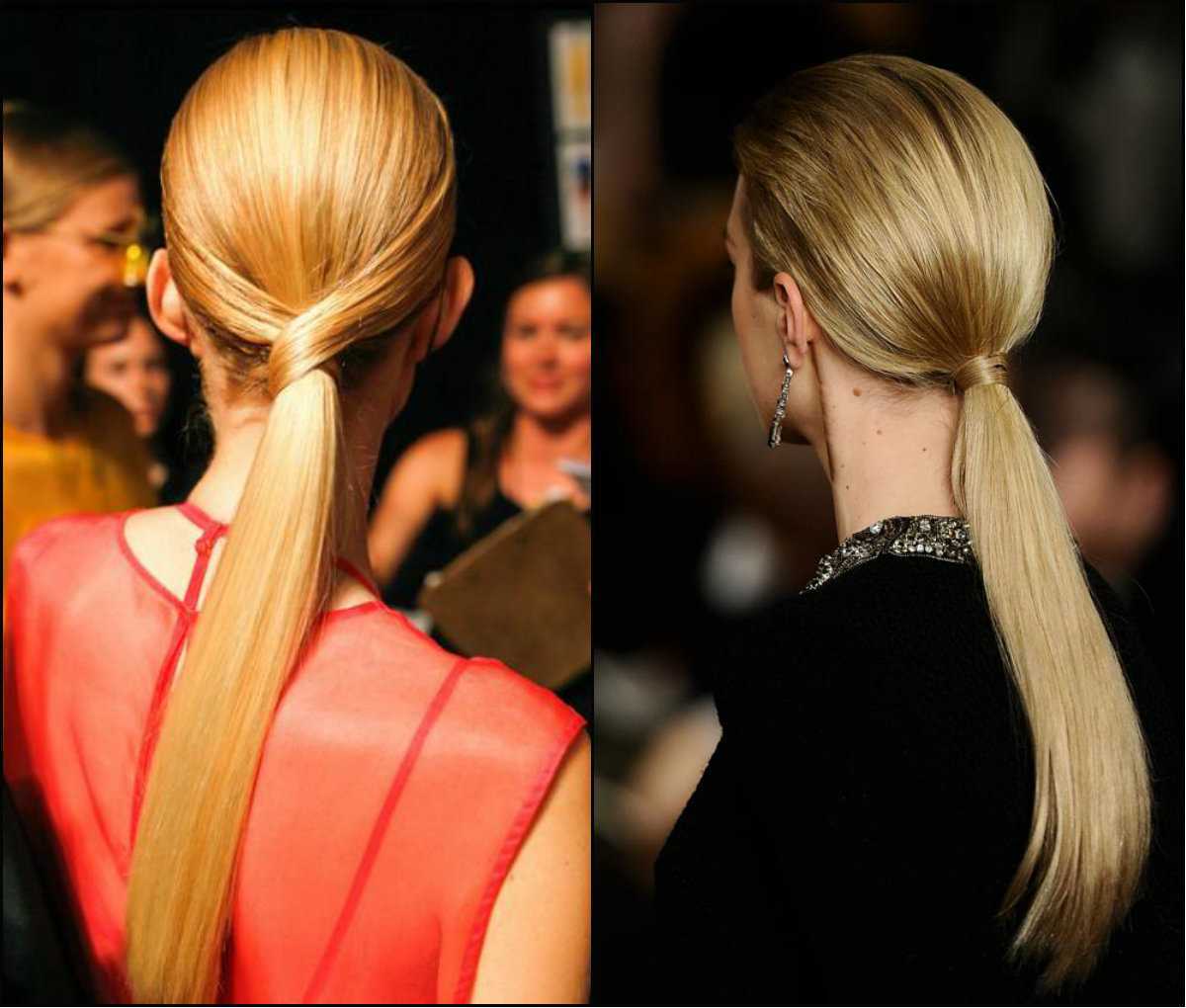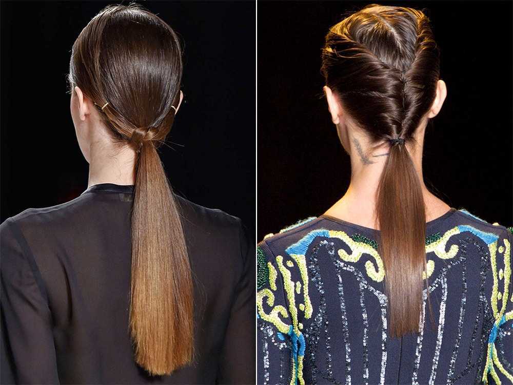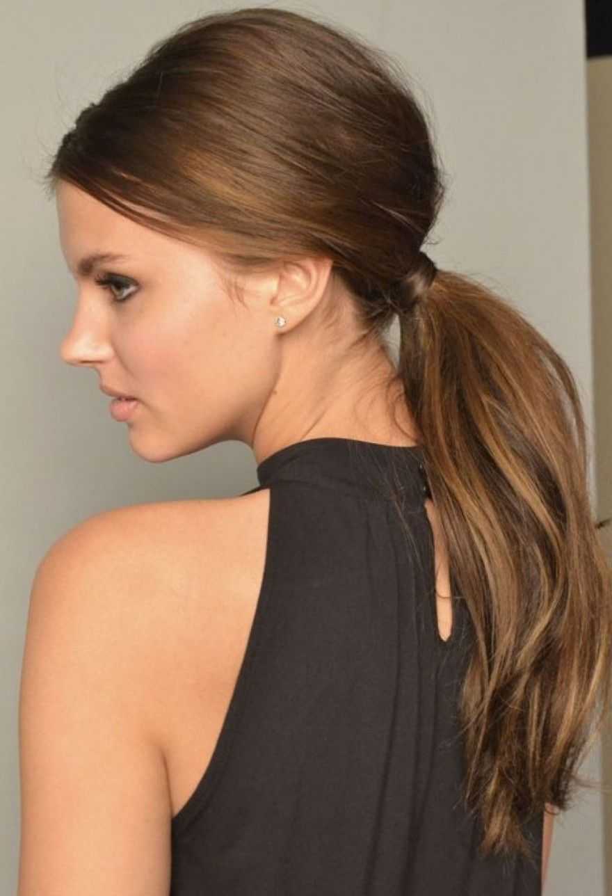 Ярко и эффектно выглядит гладко зачесанный конский хвост. Для этого волосы собираются на макушке и завязываются силиконовой резинкой. Вытянутой прядью закручивается основание хвоста.