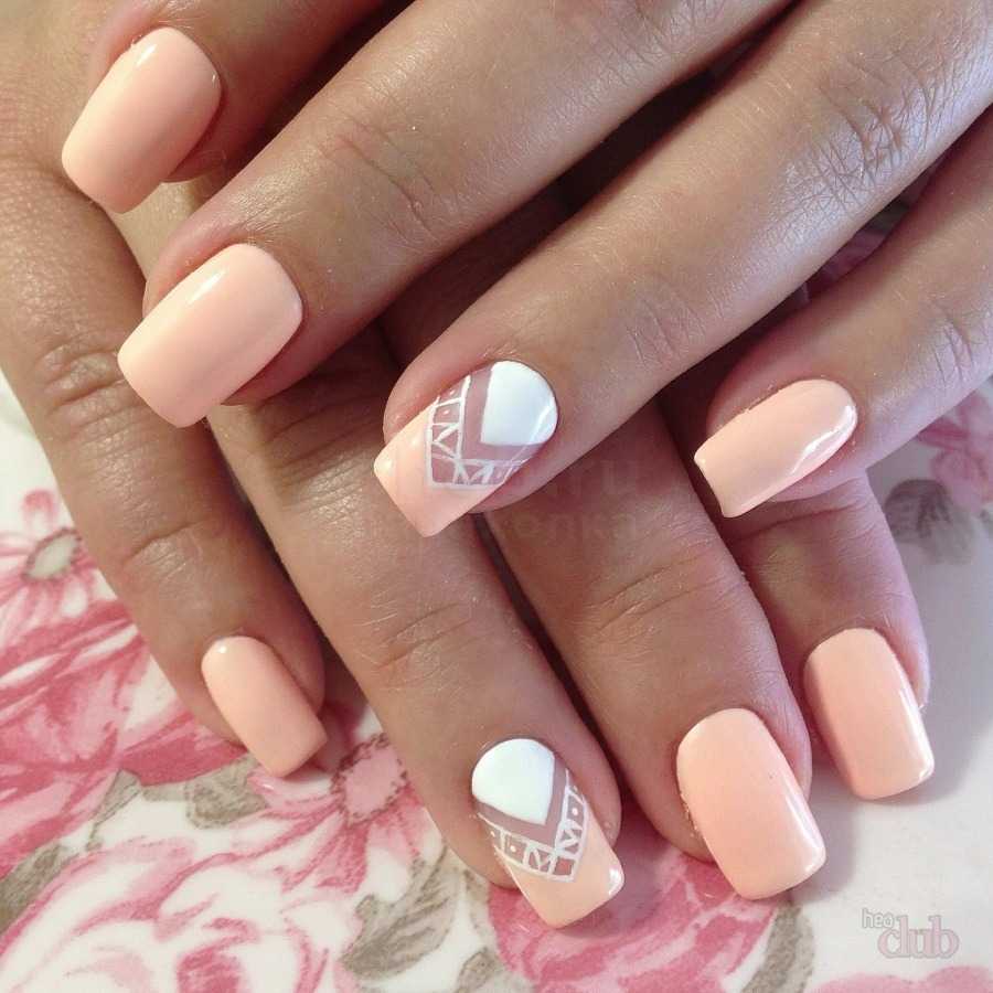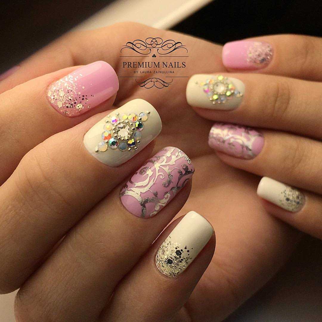 «Цвета невесты» лучше смотрятся на длинных ногтях. На коротких их тоже можно использовать, но лучше оттенять декором, визуально вытягивающим пластину. Подойдут полоски фольги или геометрия, мелкие рисунки.
