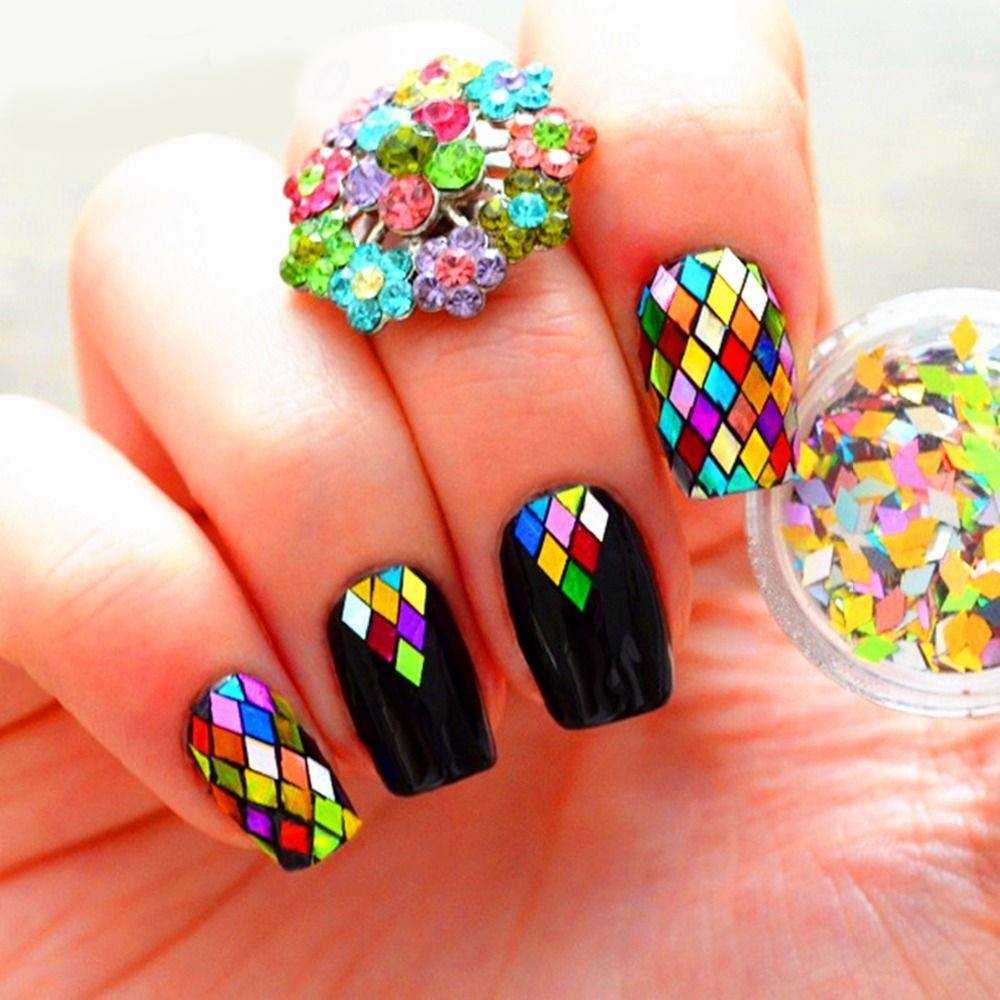 - Мозаика. Выполняется с помощью гель-лаков разных оттенков, а также фольги, слюды и блесток, которыми украшаются свободные кончики ноготков.