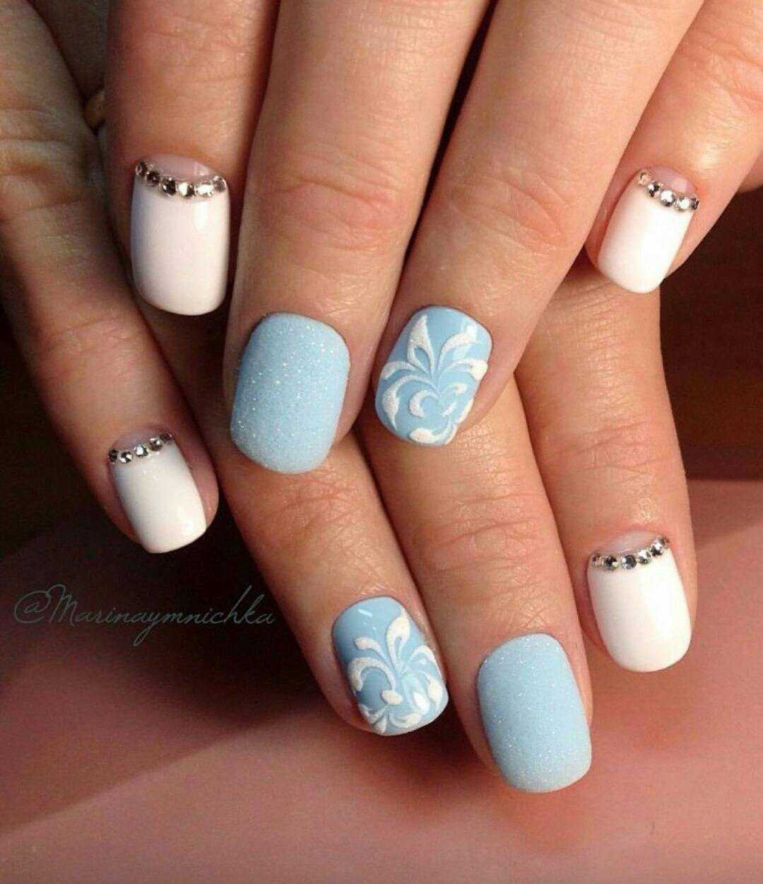 Голубой цвет великолепно выглядит в технике омбре, где оттенок плавно осветляется до белого. Такой дизайн выглядит стильно и не банально. Благодаря использованию светлых тонов дизайн не перегружается. Весь нейл-арт представляет собой нечто воздушное, легкое и неземное.