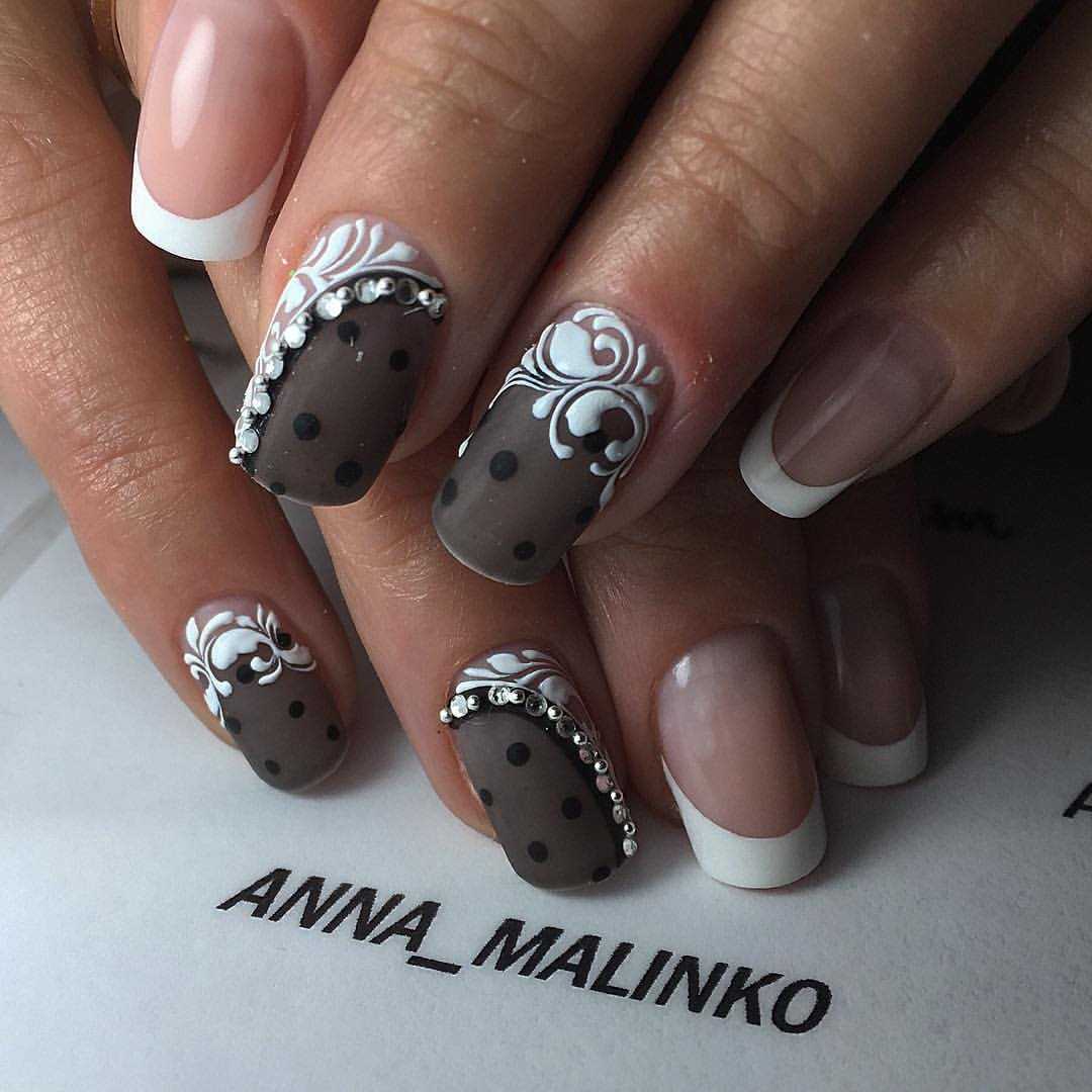 Нестареющая классика базы под нейл-арт, а так же самостоятельный цвет для покрытия. На сегодняшний день популярная концепция – чёрный с белым. Также стоит выделить розово-белый и красно-белый, сочетание для торжеств и будней. Молочный как незаменимое приложение к любому образу, создаёт ощущение воздушности.