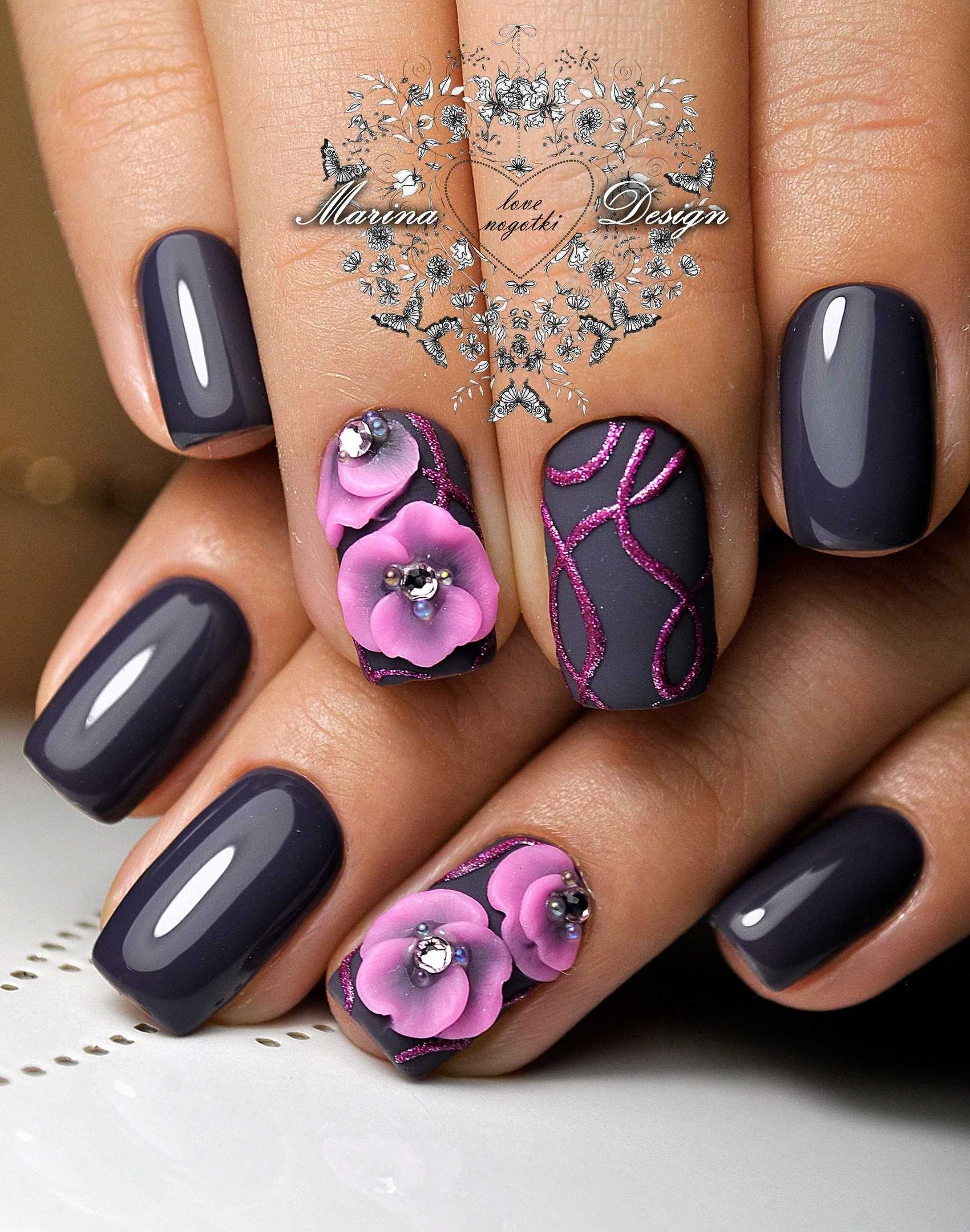 Объемный маникюр с цветами можно выполнить и без лепки с использованием бархатного песка:
