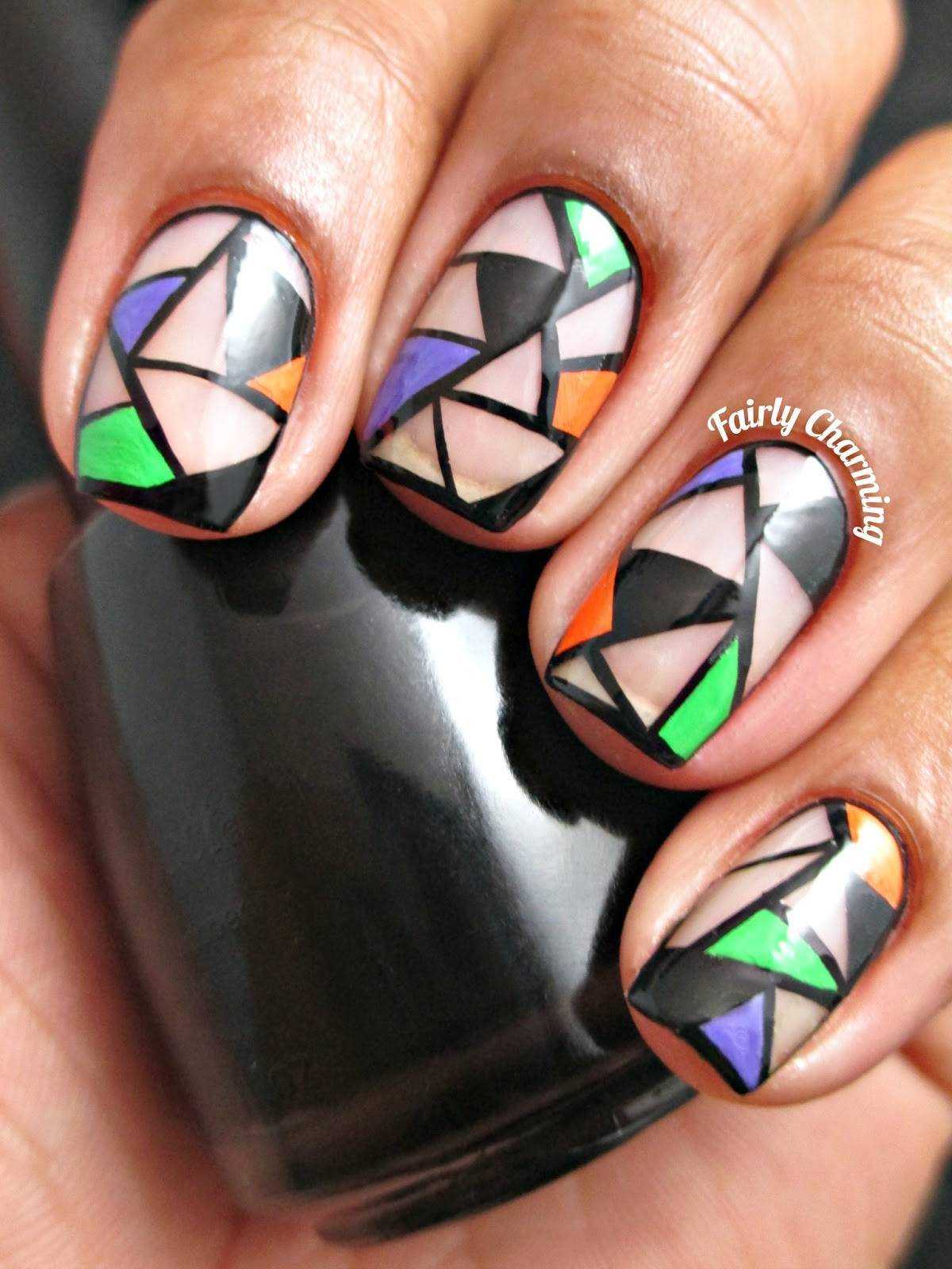 Следующий этап – нанесение тонких линий различной формы на поверхность ногтевой пластины. Лучше всего для этого подходит черный цвет. Для заполнения промежутков используйте разные яркие оттенки по собственному усмотрению. В данном случае закрепить дизайн можно простым прозрачным лаком.