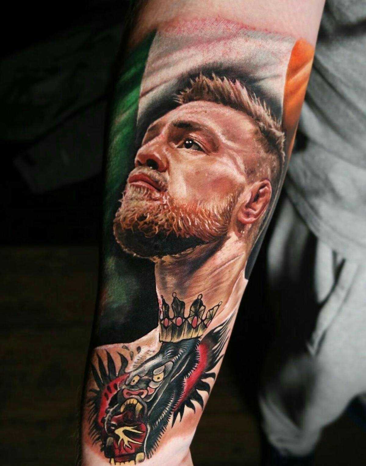 Изображения с самим Конором Макгрегором хорошо смотрится в среднем и крупном размере, так как есть возможность прорисовать детали и сделать татуировку максимально реалистичной. Такие варианты подойдут для тату на спине, груди, плече, ноге.