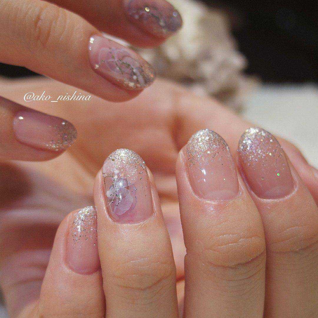Иногда выбор подходящего нейл-дизайна превращается в настоящую проблему. И речь в этом случае идёт не только о переменчивом женском настроении. Современный темп жизни, напряжённый график и домашние обязанности просто вынуждают большинство женщин отдавать предпочтение классическим либо универсальным идеям оформления маникюра. Прозрачное лаковое покрытие с использованием блестящих пигментов как никто другой подходит для данной ситуации. Главными преимуществами прозрачного маникюра с блёстками является гармоничное сочетание простоты и сияния блёсток. Среди актуальных идей выделение кончика безымянного пальчика при помощи сверкающих частиц, вариация френча, глиттерная растяжка от кончика к основанию и многие другие варианты. В качестве основании приемлемо использовать как абсолютно прозрачное покрытие, так и лак с розовым, бежевым либо персиковым поддоном.