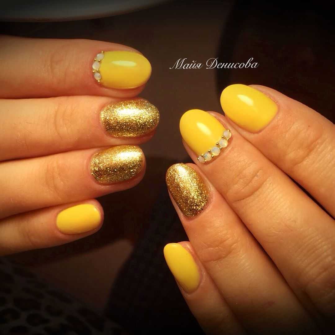 Желтый маникюр с блестками на короткие ногти