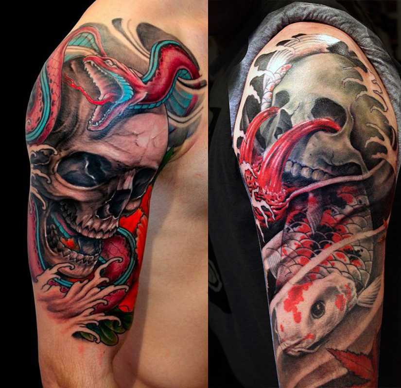 Стиль треш-полька – оригинальный вариант для любителей нестандартных решений. Экспрессивные широкие мазки, преобладание черного и красного цветов – основные характеристики подобного тату. На плече карп будет смотреться очень стильно и необычно. Фото работ и оригинальные эскизы вы можете посмотреть на сайте, чтобы подобрать вариант по душе.