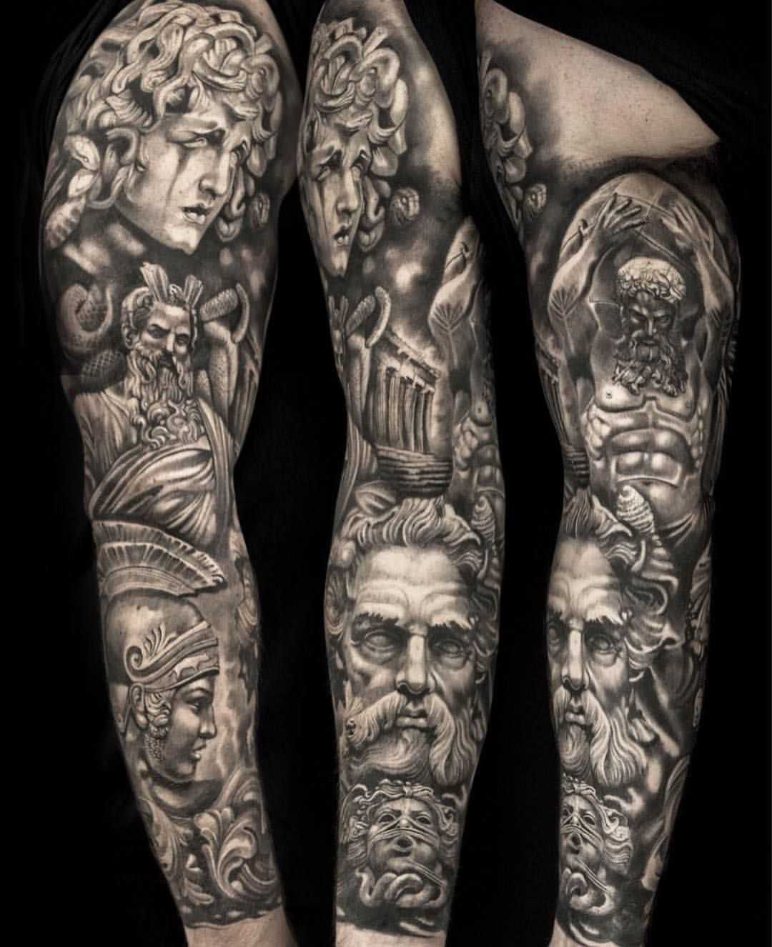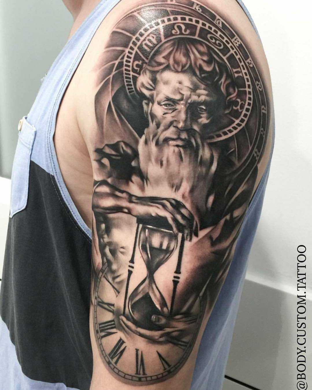 - Если говорить о «рукавах», то изображаются на них целые картины. Как правило, с определенной смысловой нагрузкой. Тут чаще всего используют композиции из цветов, различных геометрических фигур, абстракций. В общую картину отлично вписываются часы, летящие птицы, другие животные. «Рукава», как и все остальные тату, бьют как цветными красками, так и черно-белыми.