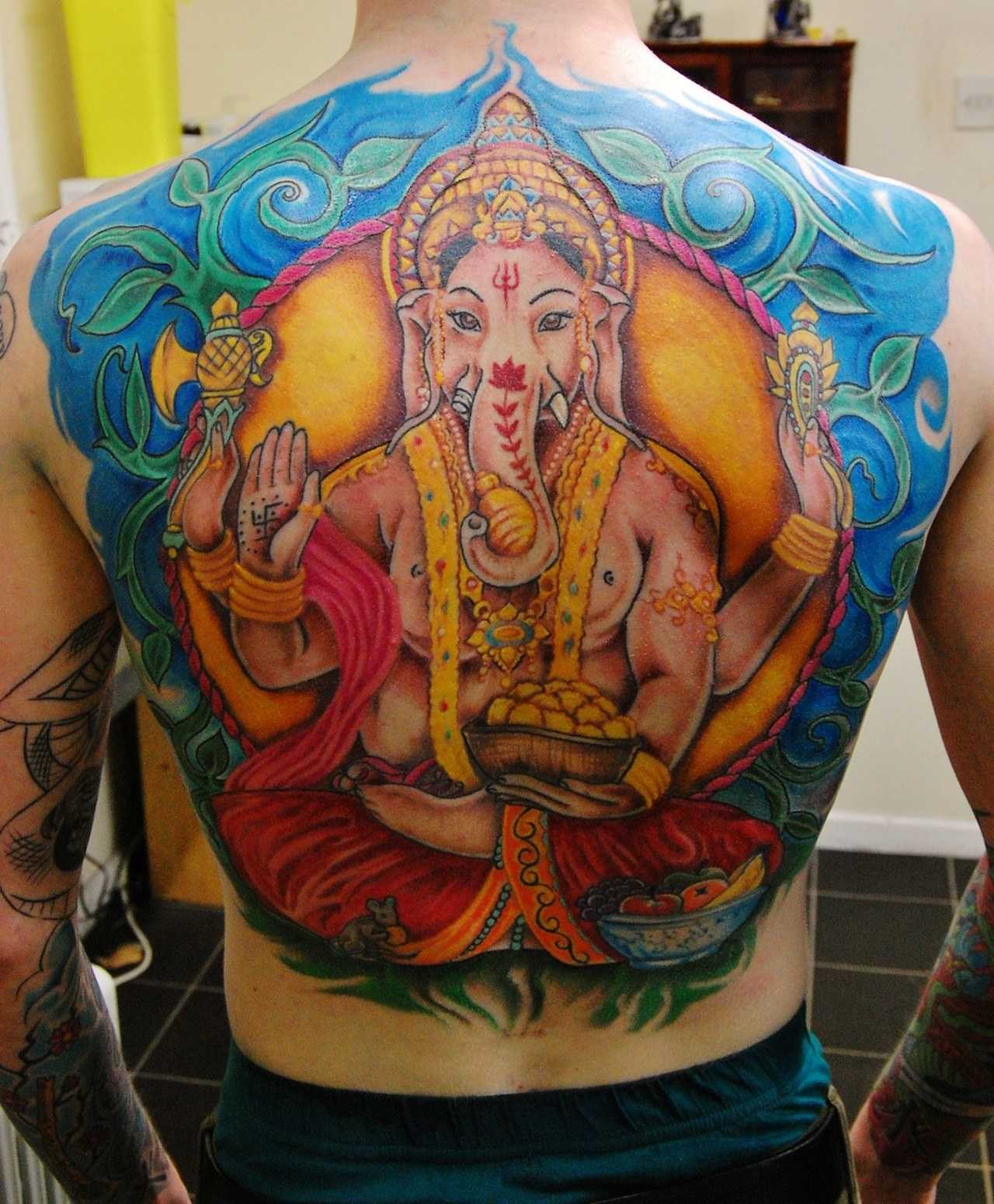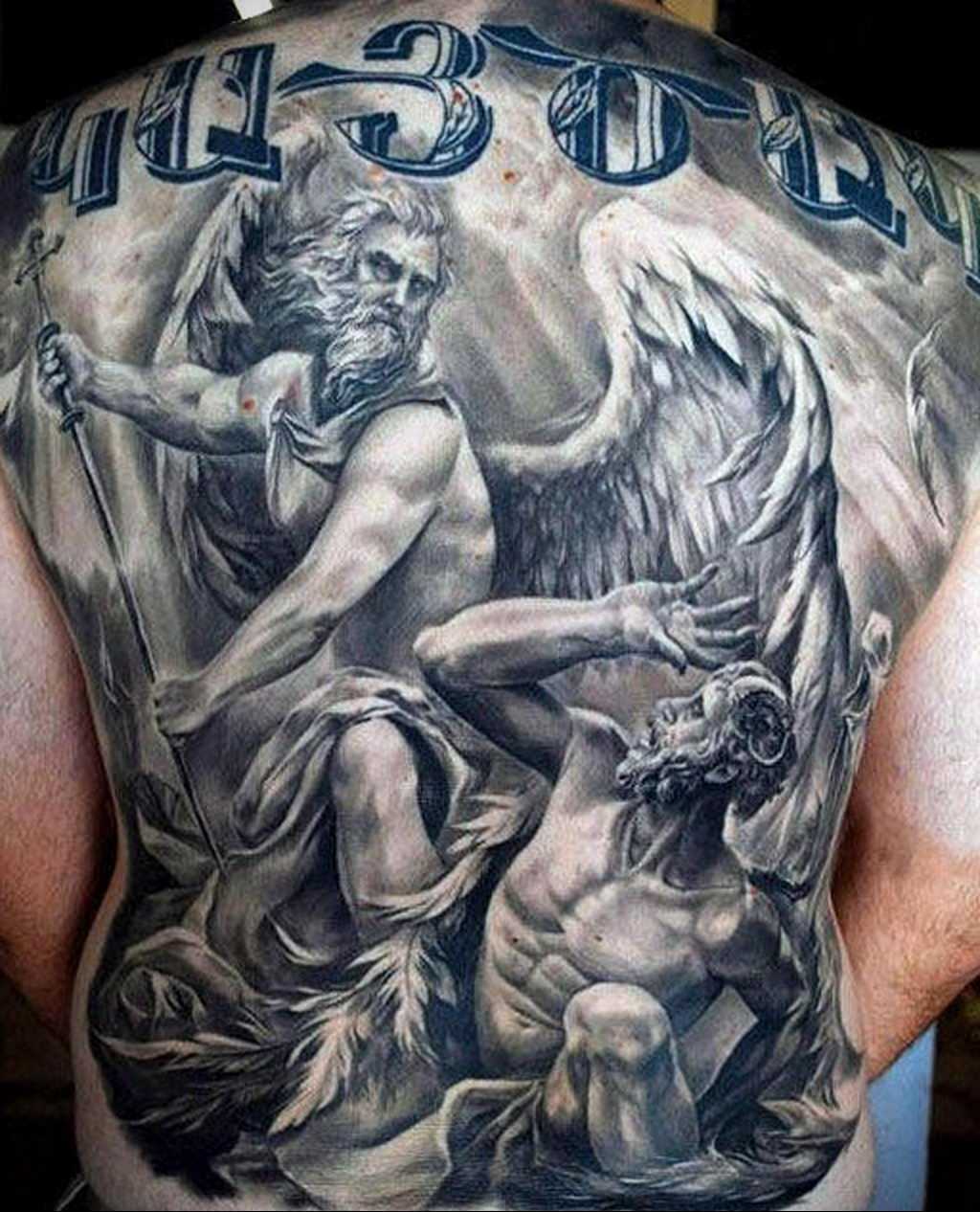 - Самые отважные и смелые наносят большие тату иконы. Их располагают на спине или животе, ведь там простор для реализации творческих идей огромный.