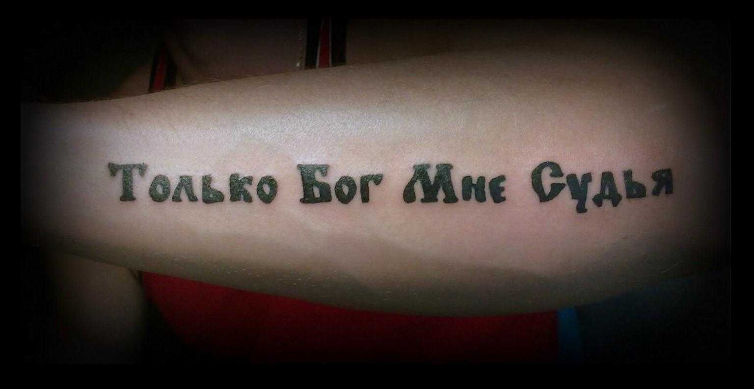 Надпись «Только бог мне судья» тату для религиозных людей с твердыми жизненными убеждениями. У выражения глубокое значение, которое частично опирается на религиозные догмы. Наличие тату на коже показывает, что носитель убежден в выбранной позиции и не готов идти на компромиссы.
