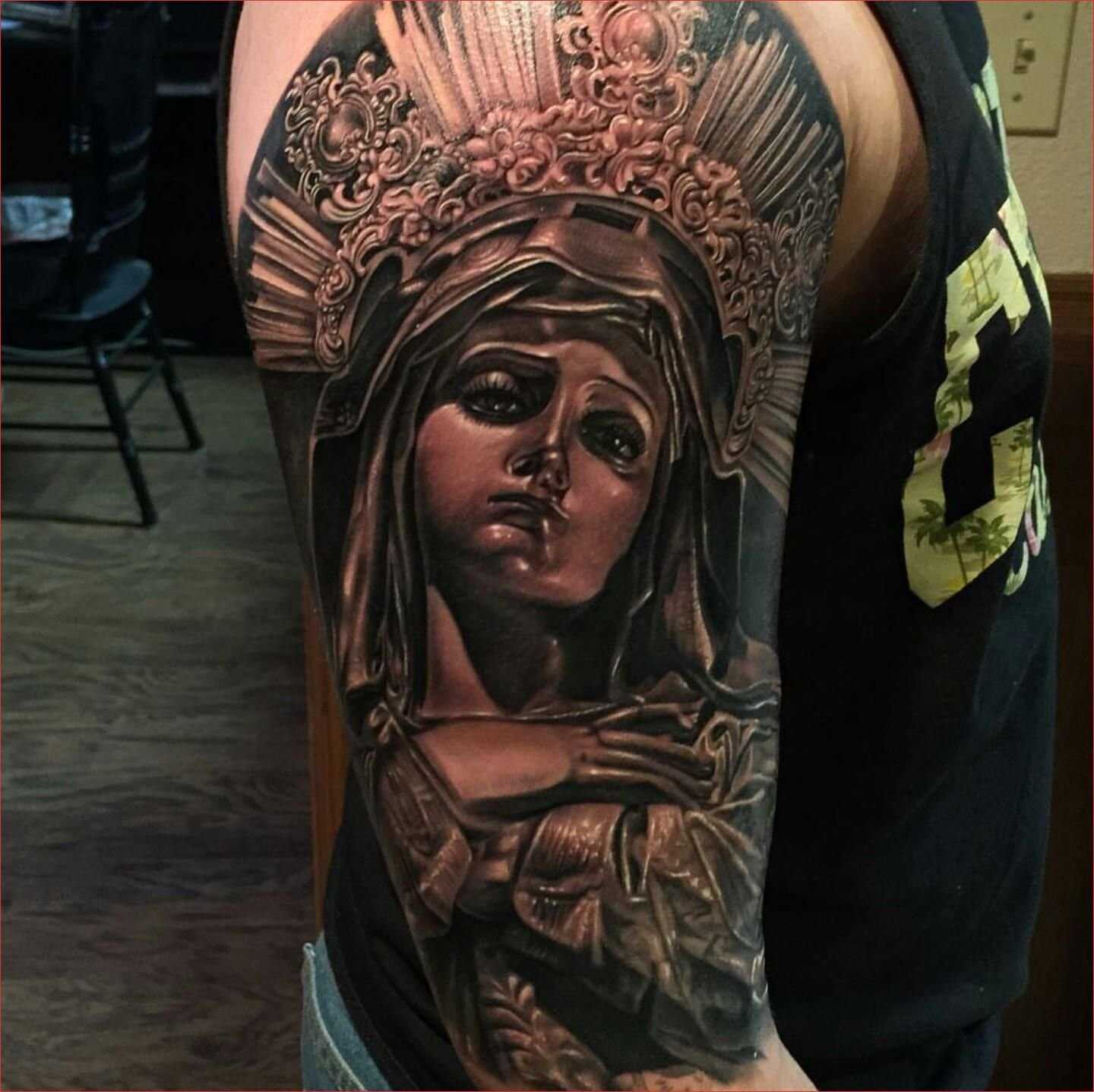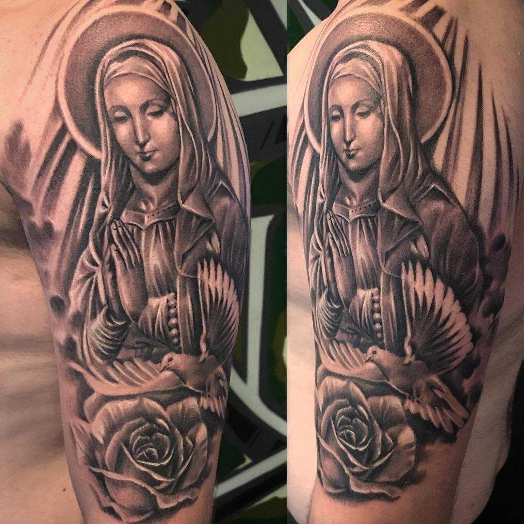 Эскиз татуировки Девы Марии чаще всего представлен в классическом черно-сером или черном варианте. Яркие цвета, такие как синий, красный и зеленый, используются редко, сохраняется обычный черный контур. Бирюзовый халат на татуировке Девы Марии символизирует победу Небес над злом.