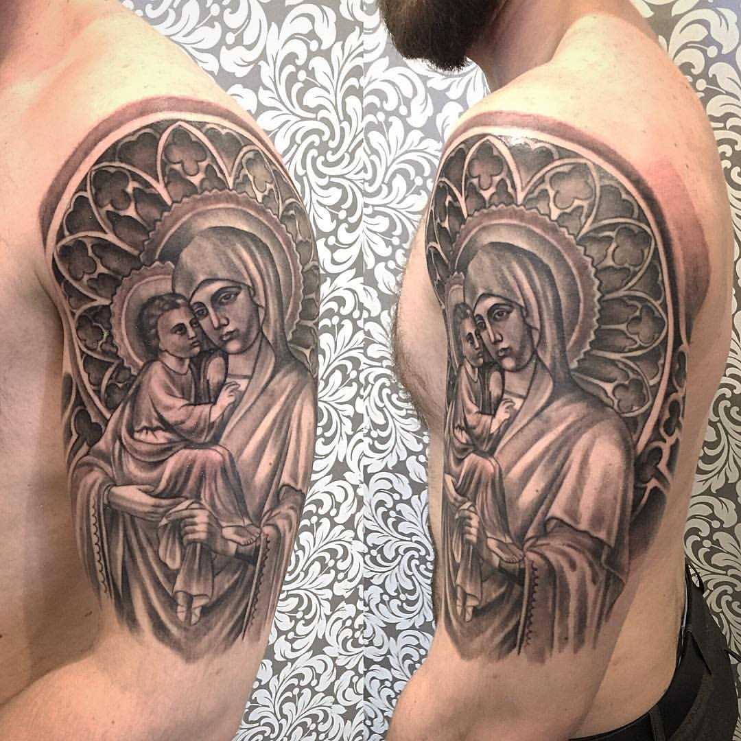 - Пресвятая Богородица и Иисус Христос – самый популярный вариант данной татуировки;