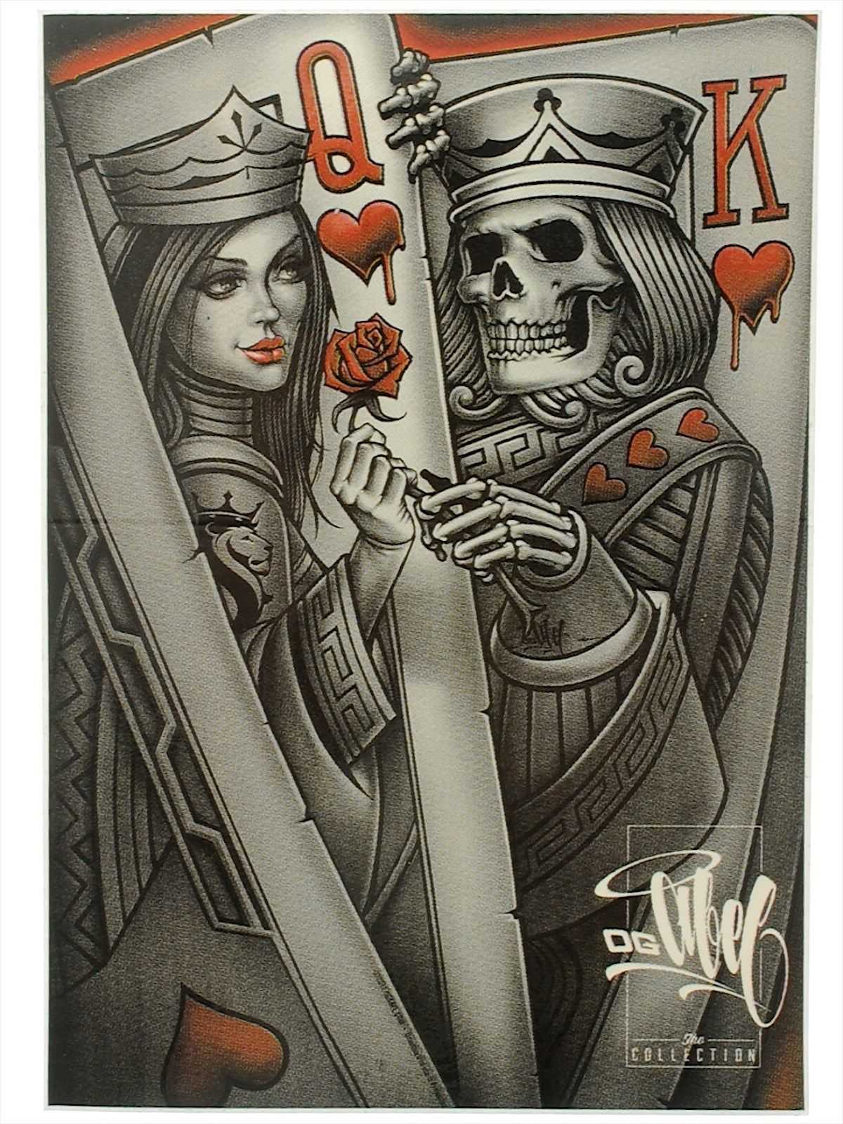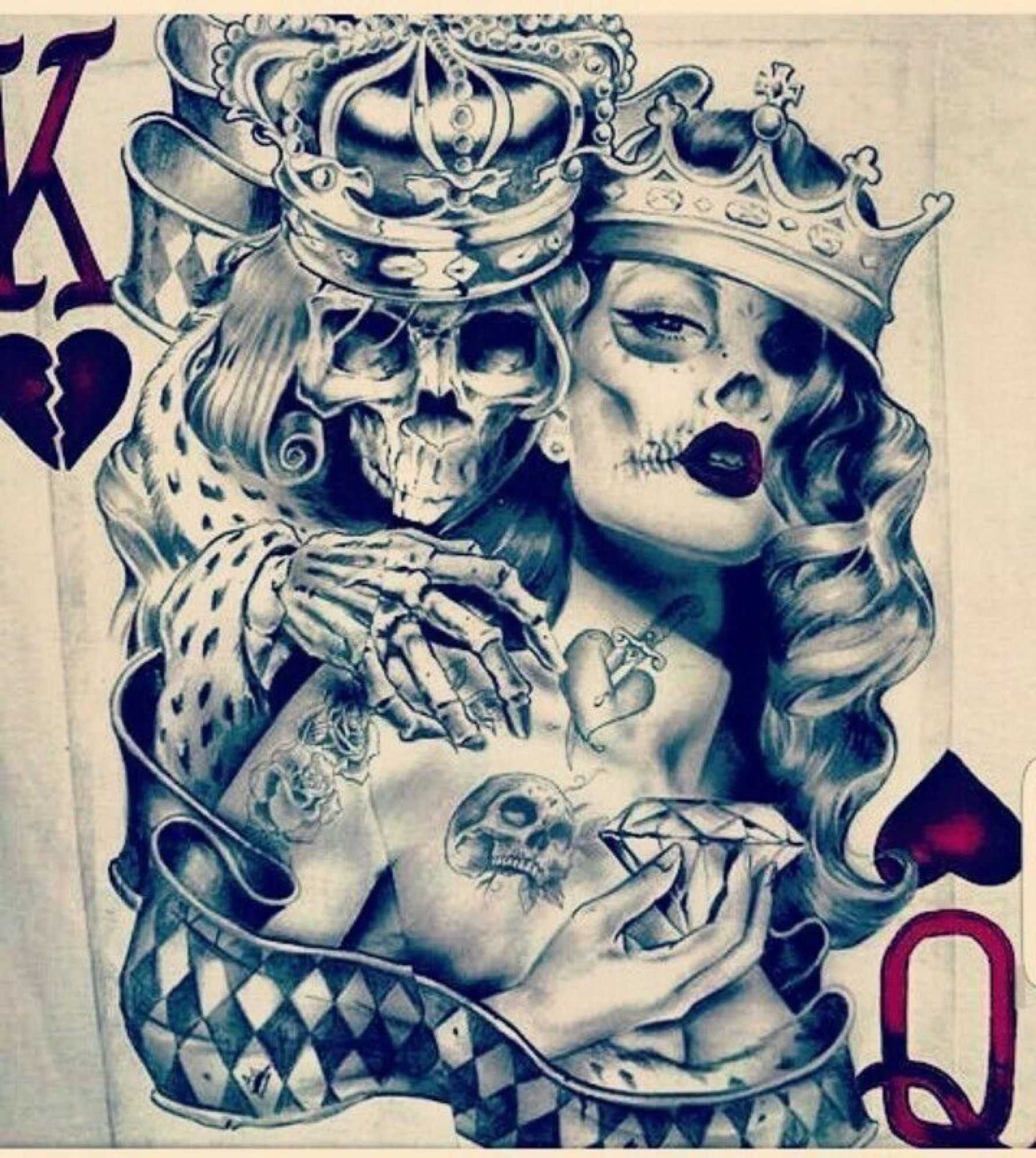 Эскизы с картами довольно популярны и представляют собой оригинальные рисунки, выполненные в различных техниках и дополненные всевозможными деталями. В качестве демонстрации силы и могущества игральные карты в эскизе часто дополняются разнообразными черепами и брызгами крови, что выглядит весьма агрессивно и немного вызывающе.