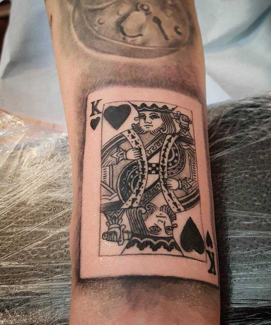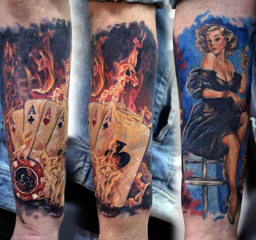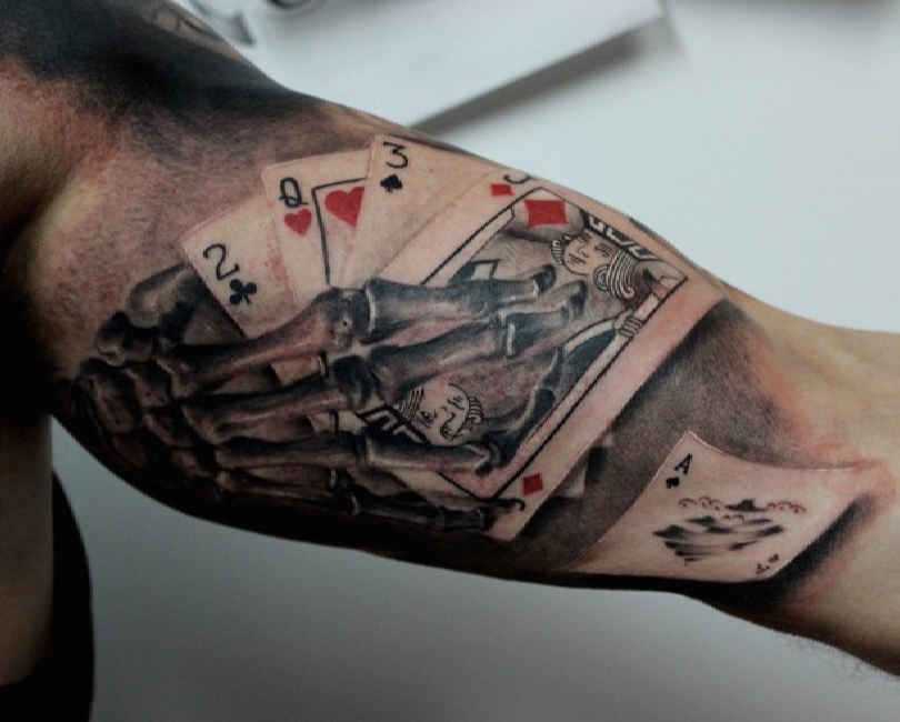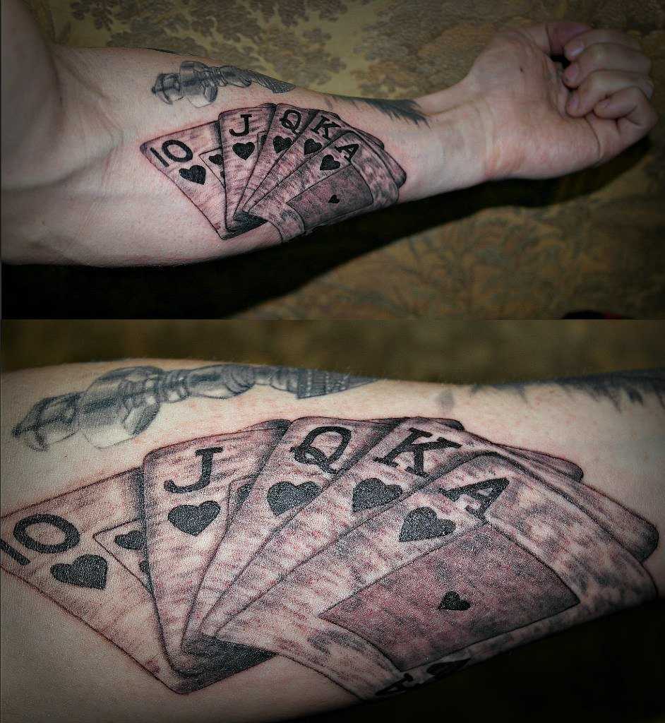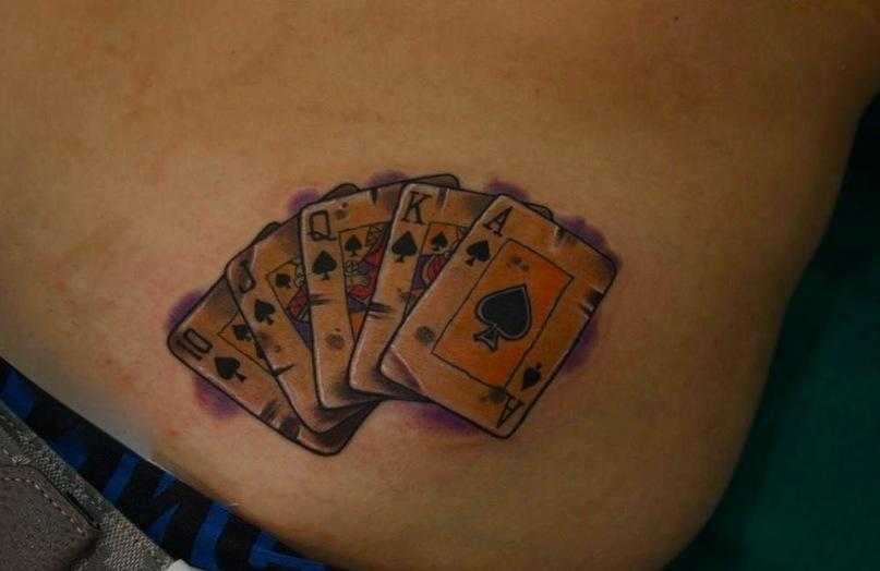 Значение татуировки «Карты» (игральные) Игральные карты – не самый древний знак, но в нем есть свое очарование, поскольку азартные игры и мероприятия существовали с самых давних времен. Изображение игральных карт на теле обозначает азартность, удачу, стремление к победе, желание добиться цели и получить заслуженный выигрыш. Иногда карты символизируют грех или плохой поступок, совершенный человеком в прошлом, а рисунок напоминает носителю об этом, чтобы ошибка больше не повторилась. Расшифровка карточной символики во многом зависит и от масти карты, поэтому человеку следует детально изучить всю информацию о рисунке.