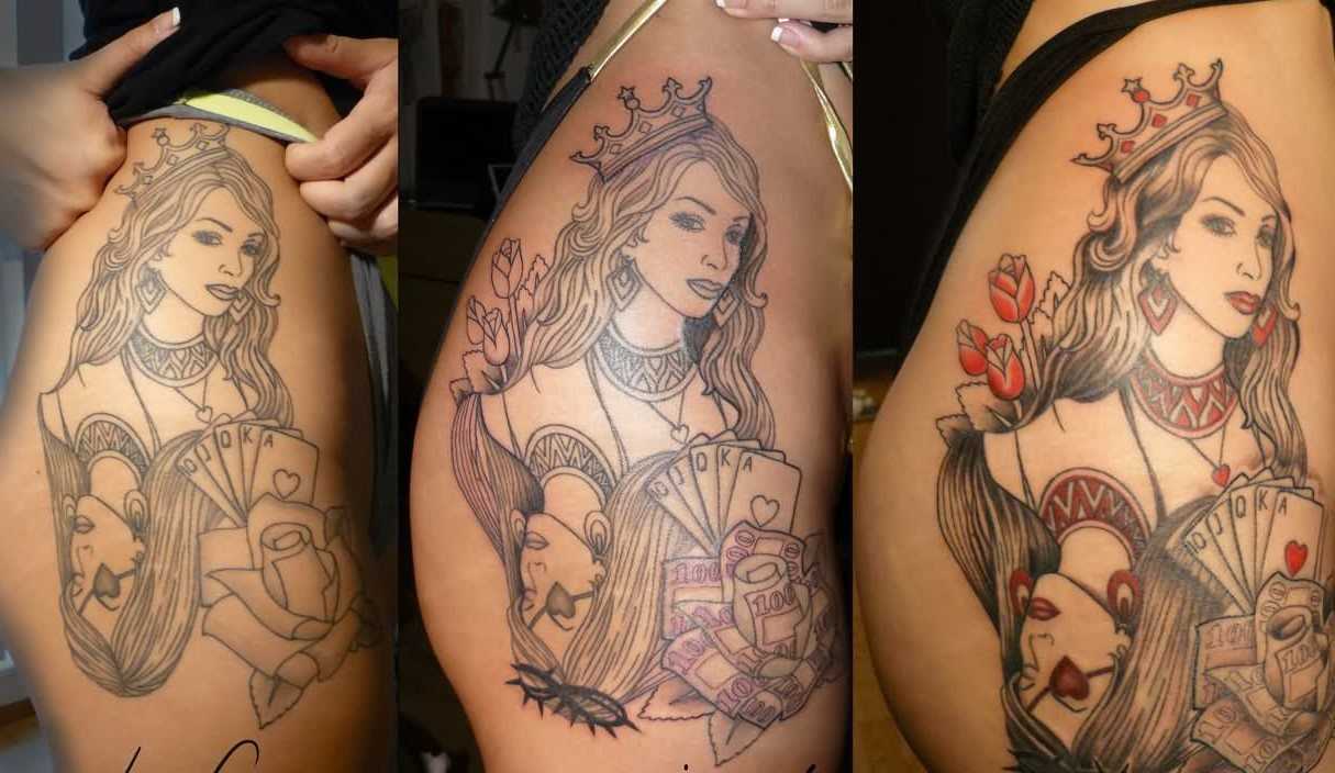 - Эстетический дизайн – включает изображение дамы червей с использованием ярких цветов и многомерных эффектов. Он создает полноту, становится частью тела и олицетворяет индивидуальность татуированного человека.
