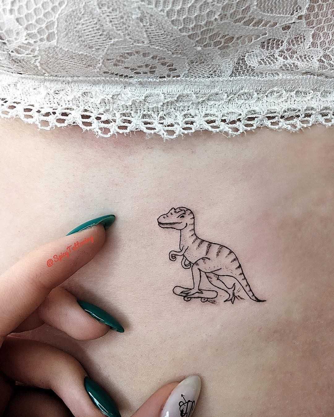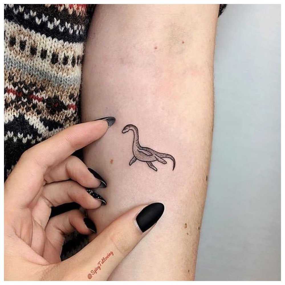 Девушки чаще всего выбирают наивно-милые изображения динозавров — героев мультфильмов. Смешные и симпатичные образы говорят о хорошем чувстве юмора владелицы тату, которая не прочь посмотреть увлекательный фантастический фильм о легендарных существах или почитать книгу о них.