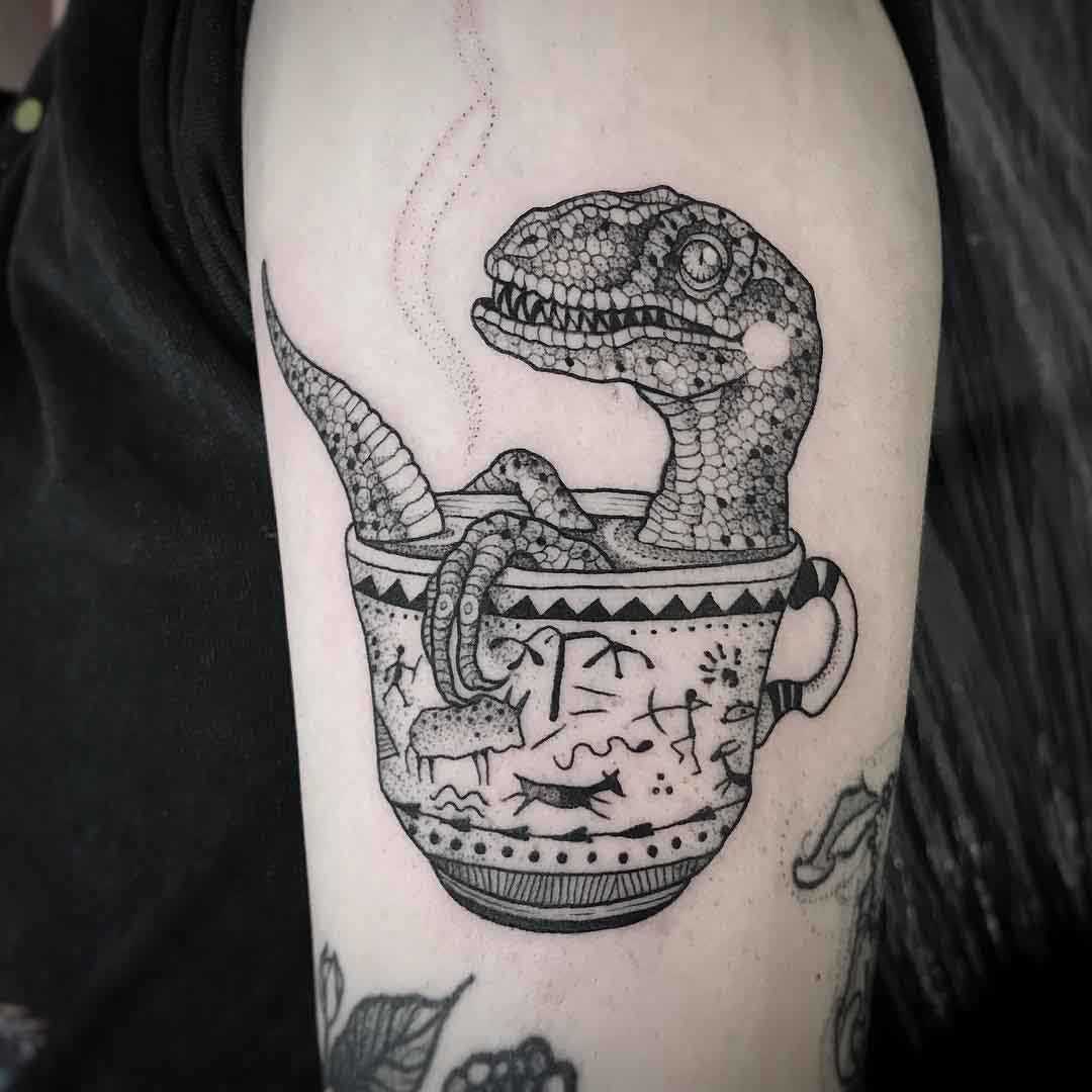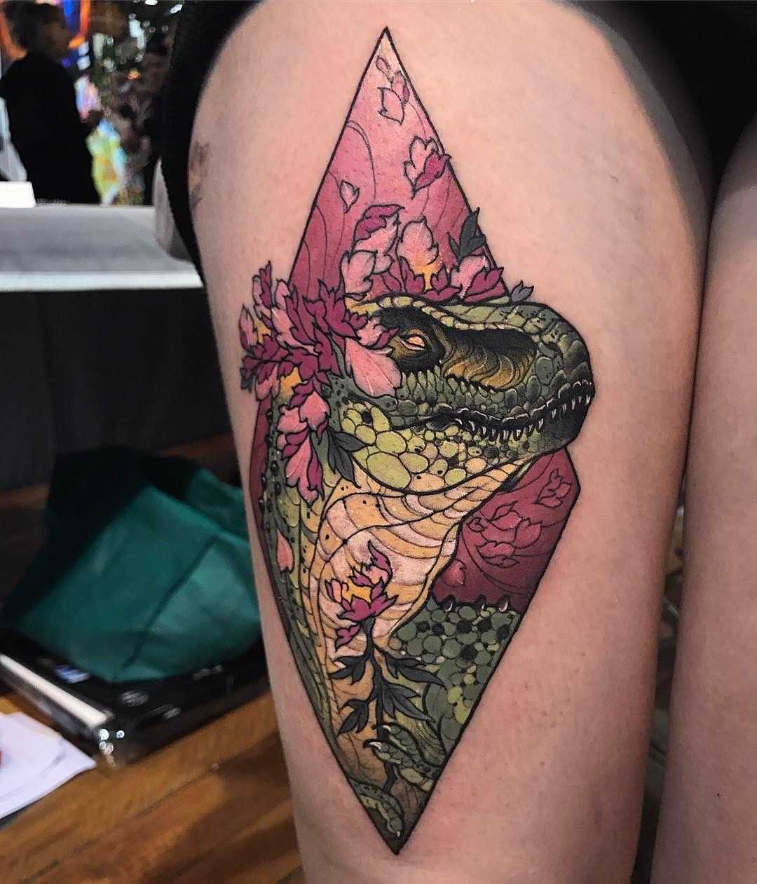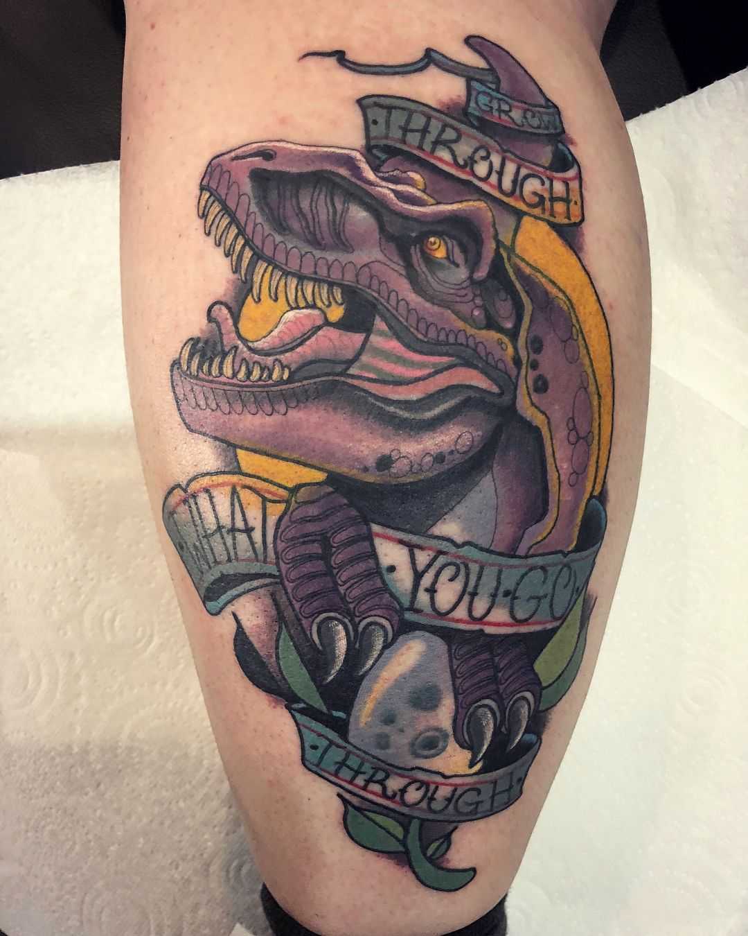 Это татуировка, которая часто имеет более глубокий смысл для ее носителя. Это показывает его способность преодолеть большую жизненную травму и родиться заново более сильным и злым. Эта татуировка больше, и динозавр выглядит опасным.
