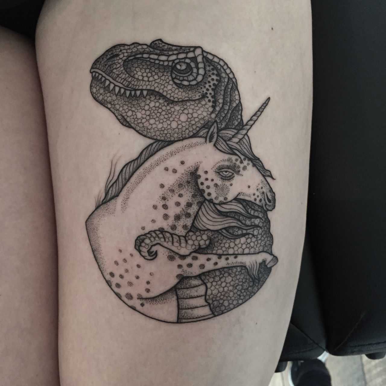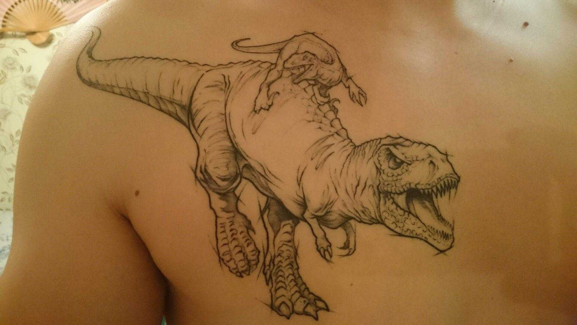 Эта татуировка отлично подходит в качестве центрального элемента на спине, и она включает в себя шедевр двух динозавров в борьбе, детализированный до мельчайших деталей. Он выглядит чрезвычайно мощным, а татуировка делает динозавров почти живыми.