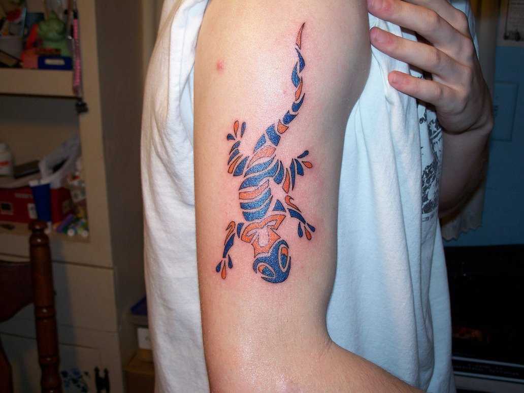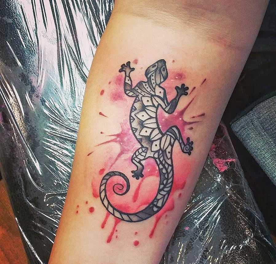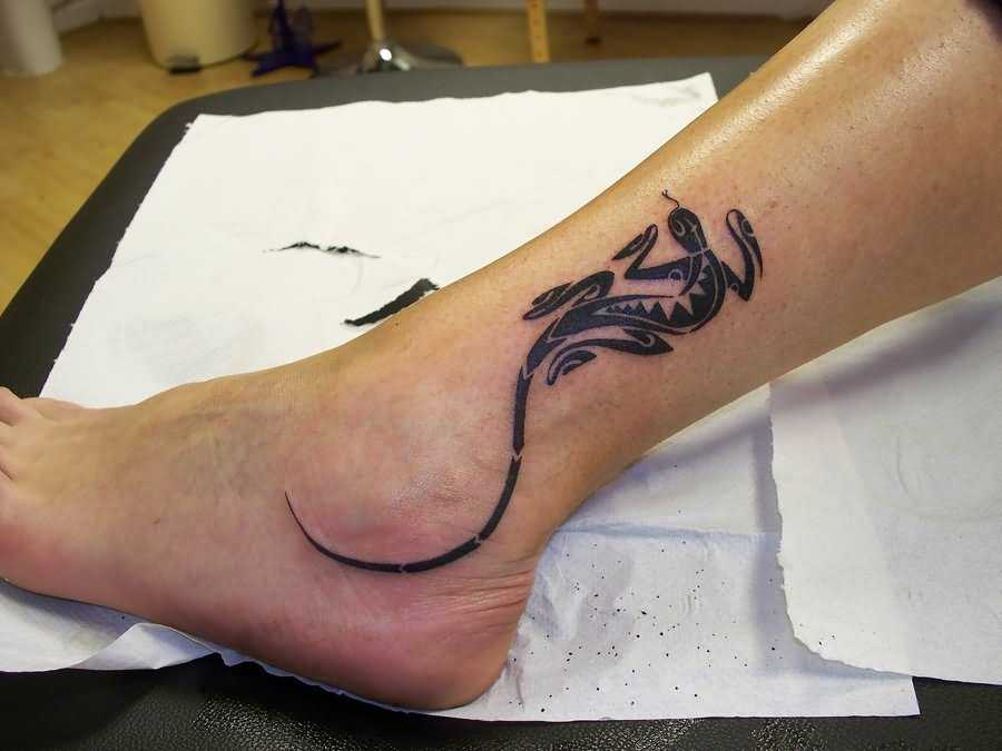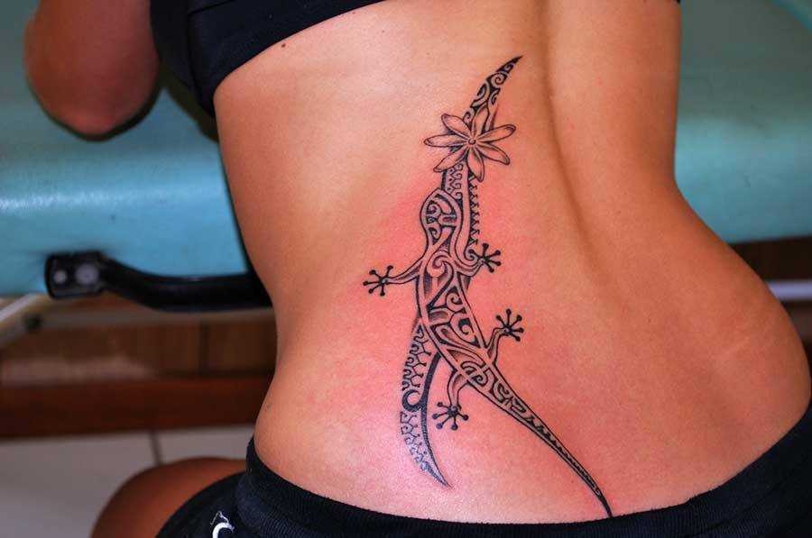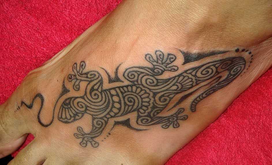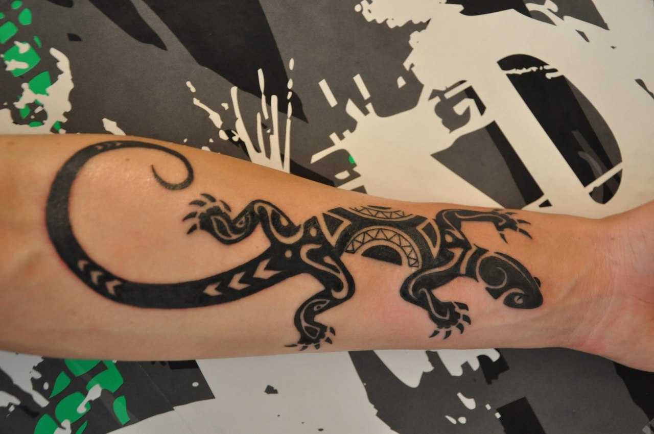 Не менее привлекательно смотрится ящерица в короне, которая является воплощением власти и величия, авторитетности и духовного просветления. Также можно экспериментировать с цветом рисунка, тем, куда направляется ящерица. Что касается стилевого решения, то особой популярностью пользуются полинезийские ящерицы, маори, ящерицы-саламандры.