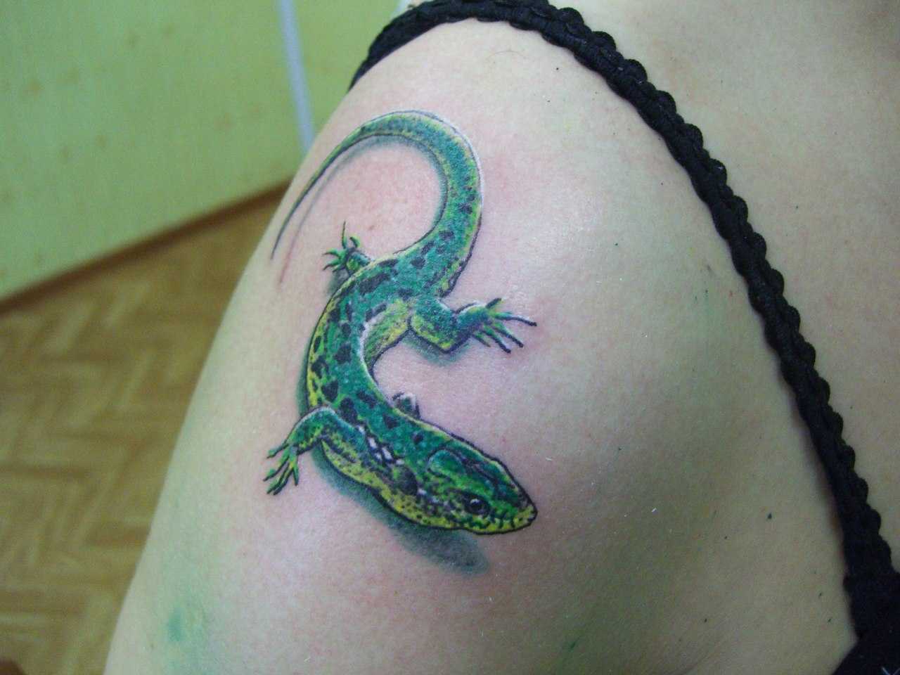 Тату с ящерицей известно достаточно давно и использовалось еще с древних времен. В большинстве случаев при создании татуировки ящерицу изображают в виде английской буквы «S», но, несмотря на это, татуировка может быть уникальной, ведь ящерицы могут иметь большое количество видов и цветовых решений.