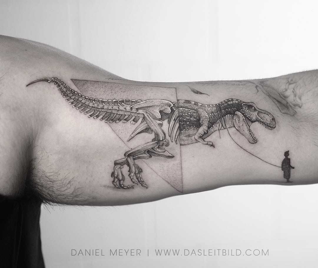 - Для парней – бицепс, предплечье, само плечо. Классический вариант, который никогда не будет проигрышным. На этом участке тела отлично будет смотреться и скелет динозавра тату, и реалистичный хищник, и схематичное изображение.
