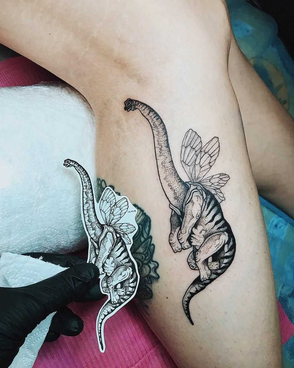 - Также татуировка динозавра может быть выбрана для выражения любви к научным открытиям и изучению истории. Динозавры, являясь предметом интереса для палеонтологов и исследователей, могут быть символом любознательности и стремления к познанию.