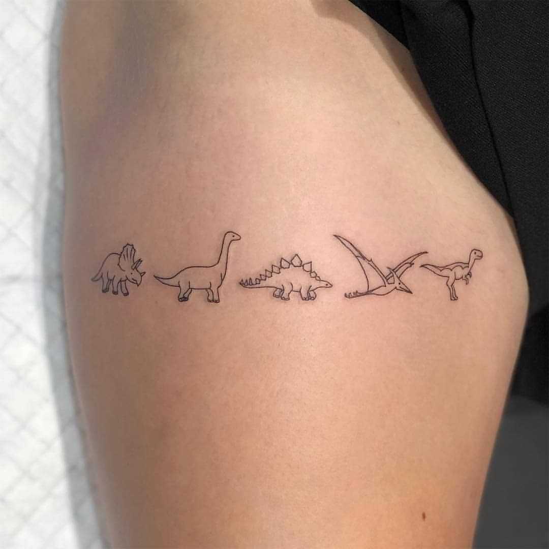 Создайте татуировку, которая напоминает иллюстрацию из детской книги о динозаврах. Используйте яркие цвета и простые формы, чтобы придать вашей татуировке игривый и нарисованный вид.