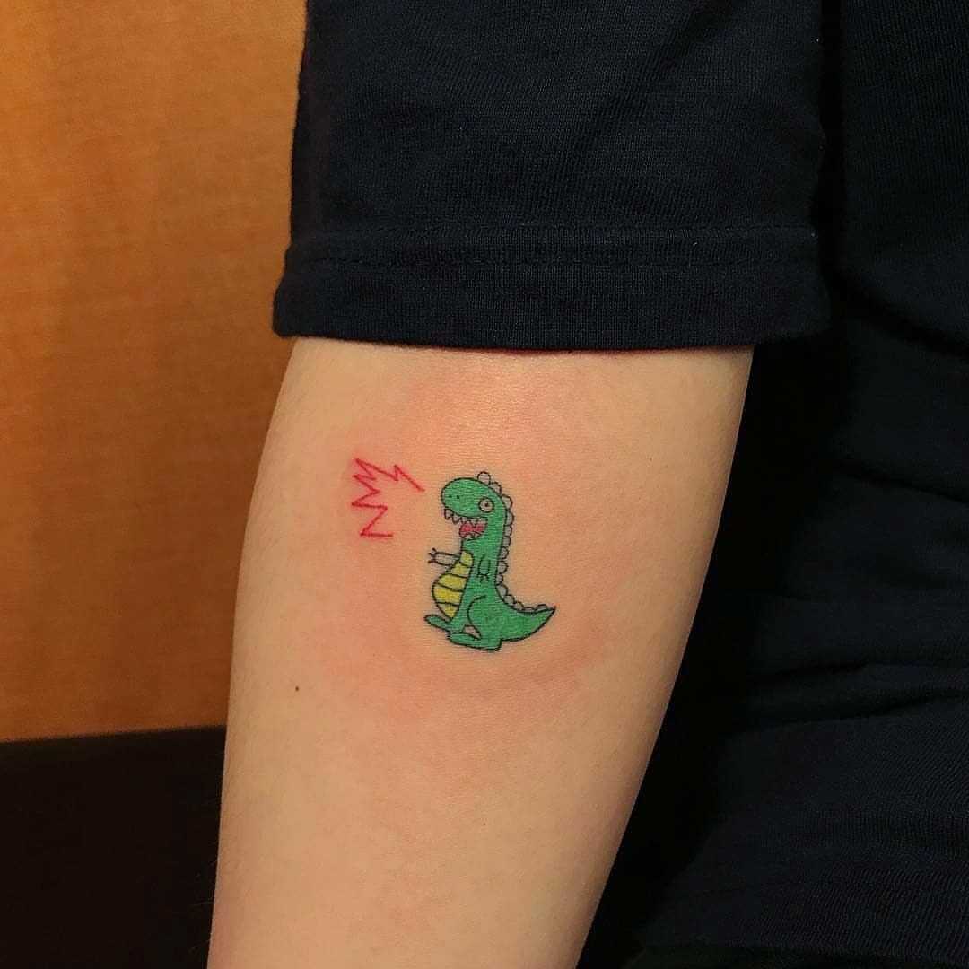 Тату с изображением динозаврика, который похож на героя какого-либо мультфильма или комикса, толкуется как символ доброй, весёлой личности, которая всегда находится в мажорном настроении и оптимистично верит в счастливое будущее. Обладатель этой татуировки — экстраверт, готовый в любой момент прийти вам на помощь.
