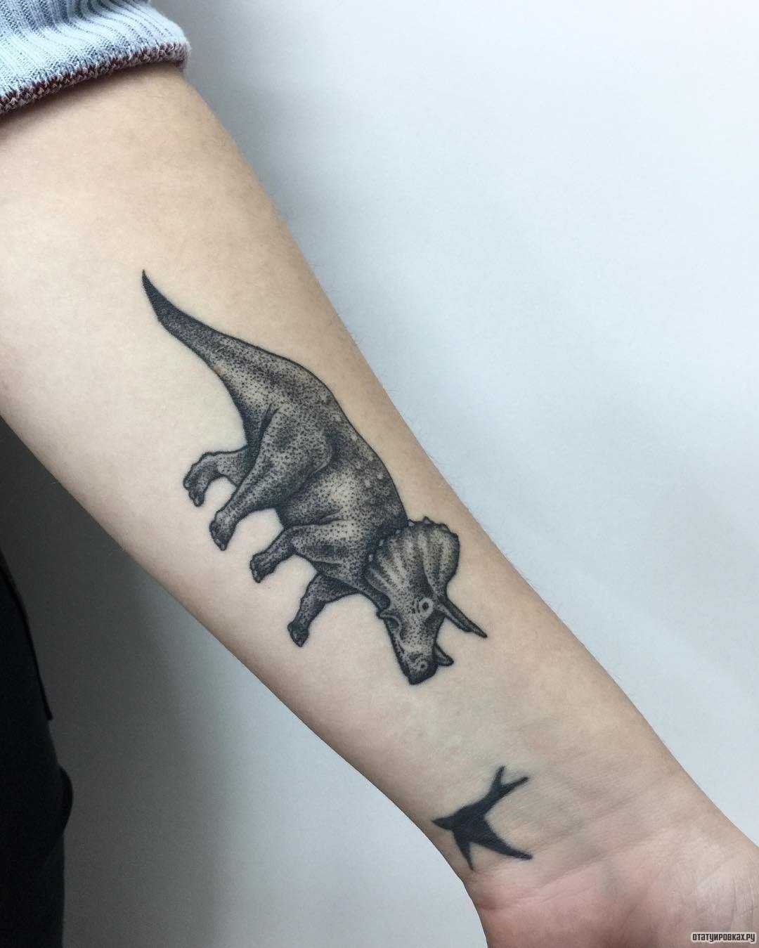 Кроме того, выбор определенного вида динозавра для татуировки может также иметь свой смысл. Например, тираннозавр символизирует лидерство и господство, трицератопс — живучесть и защиту.