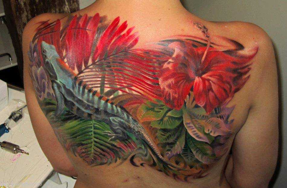 Мужчины зачастую изображают ящерицу самостоятельно, без каких-либо дополнительных элементов или предметов, а вот девушки любят экспериментировать. Самый популярный вариант – ящерица в цветах, но нужно помнить, что толкование тату будет зависеть от типа цветов. Часто используемые варианты: ящерица в лилиях, лотосах, гладиолусах, маках или тюльпанах.