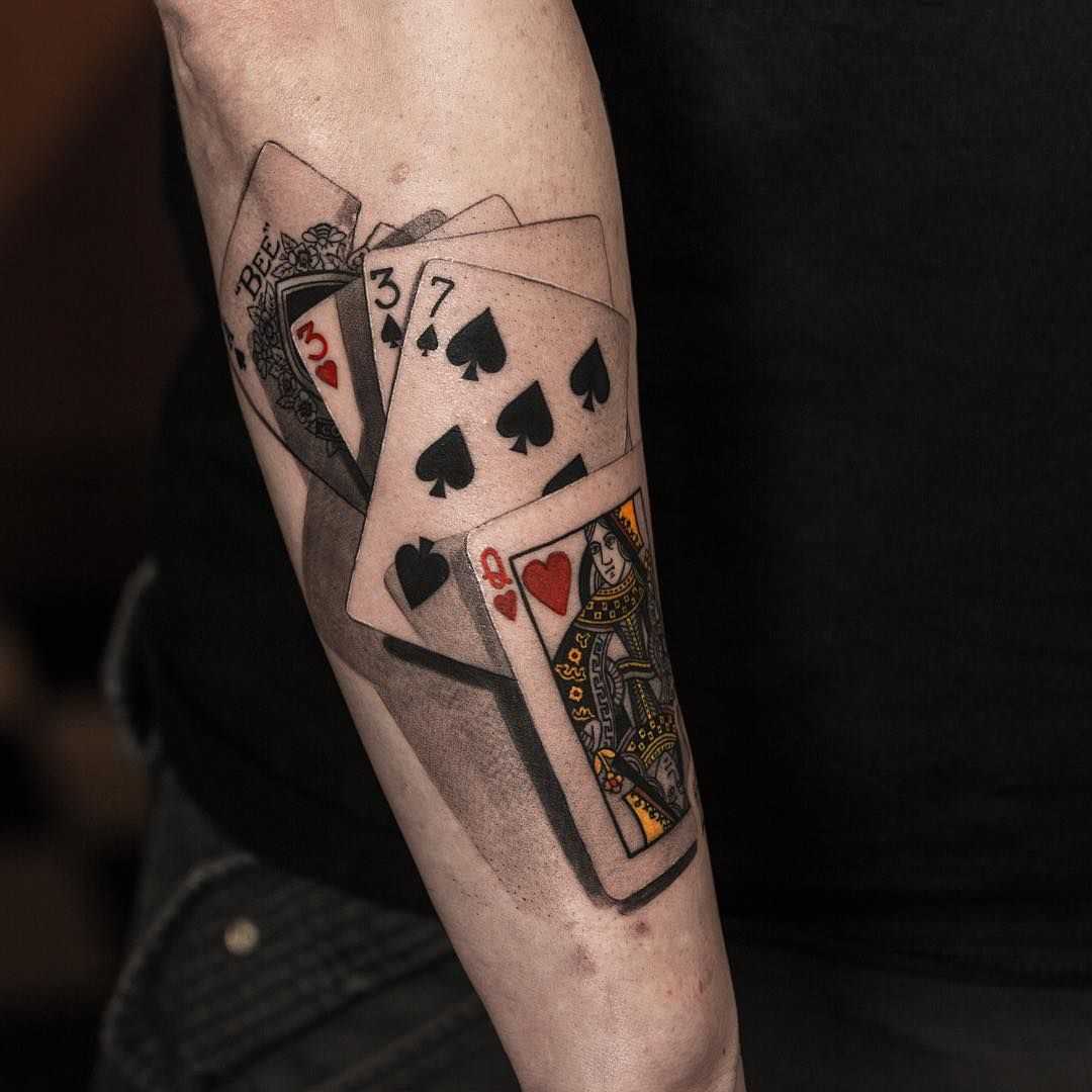 Значение тату сегодня заключается в демонстрации черт характера человека, и к ним уверенно можно отнести рискованность и азарт. Также считается, что игровые карты могут принести удачу в трудных ситуациях и бизнесе.