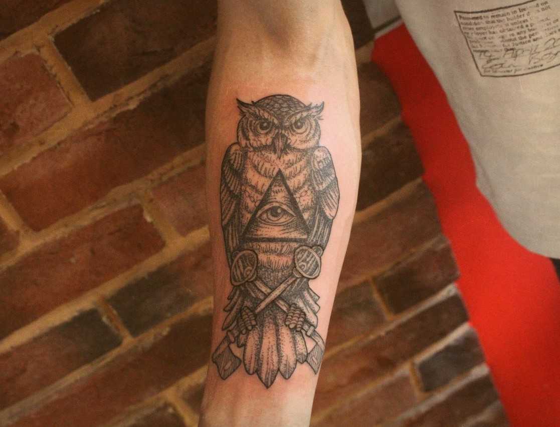 Сегодня этот птичий образ не воспринимается так агрессивно, поэтому татуировка филин подойдет для мужчин любого возраста и круга. Люди, предпочитающие такое тату, обладают острым аналитическим умом, жизненным опытом, мудростью, спокойствием и уравновешенностью. Они способны дать нужный совет, поддержать в трудную минуту. Своему владельцу тату филин обеспечит глубокие знания и способности к науке и творчеству. Подобная татуировка на предплечье также означает, что перед вами – человек необычный. Возможно, он наделен способностью предсказывать дальнейшие события жизни либо проводить магические ритуалы.