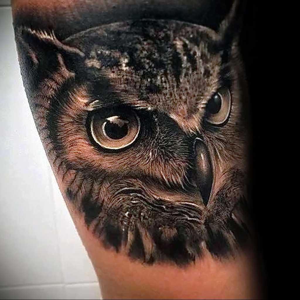Филин фото в цветном варианте красиво выглядит в стиле реализм. Эскиз тату с филином в данном направлении отличаются насыщенной цветовой палитрой и детализацией. Особенно это касается большой композиции, которая будет уместно смотреться на руке или на предплечье. Монохромные тату на икре мужские – хороший выбор для тех, кто находится в хорошей физической форме. Для техники исполнения тату подойдет гравюра или дотворк. Это стили, которые отличаются лаконичностью и четкостью линий, без пафоса и лишних деталей. Татуировка птицы на ноге или на предплечье станет отличным украшением для тех, кто знает толк в искусстве нательной живописи.
