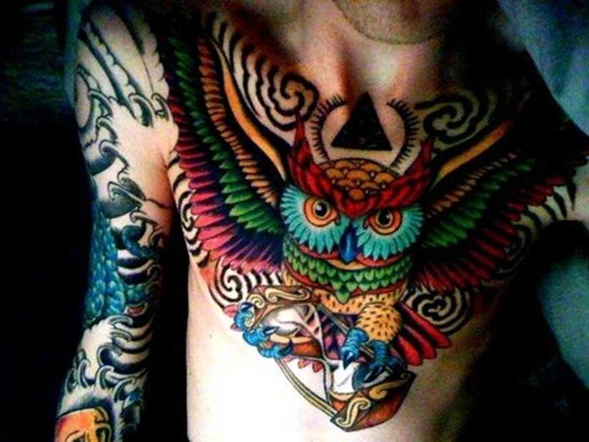 Основные значения сюжетов с совой, используемых для мужских татуировок: уравновешенность, мудрость, покой. Такие рисунки часто выбирают волевые люди с аналитическим умом. Для сдержанных личностей подходят черно-белые тату, а для креативных и бесшабашных – многоцветные изображения.