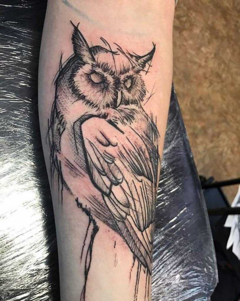 Во многом выбор эскиза и техники выполнения татуировки зависит от того, что именно вы хотите видеть на своём теле и какую символику для этого изберёте. Эскизы в мультяшном стиле всегда яркие и заметные. Реализм в цветном исполнении позволяет подчёркивать самые мельчайшие детали. Гравюра или направление дотворк отличаются лаконичностью и чёткостью линий. В таких монохромных рисунках отсутствуют лишние детали и пафос. Эскизы в технике полинезия или этника подчёркивают интерес к эзотерическим премудростям и экзотическим культурам. Изображение филина может дополняться различными орнаментами, фонами ночного неба, часами, ключом, разнообразной растительностью, стрелами, черепами или ловцами снов.