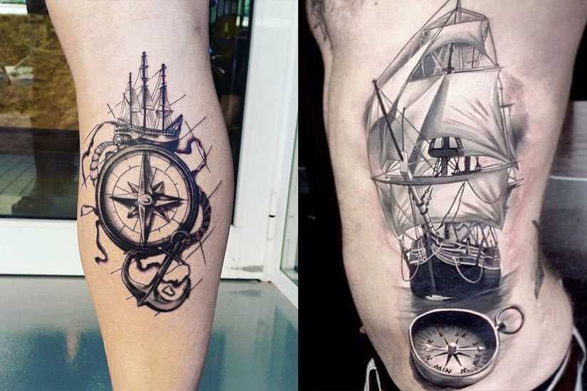 Тату корабль иногда дополняют изображениями розы ветров, компаса, маяка, надписями: «родина», «свобода» и т.п.