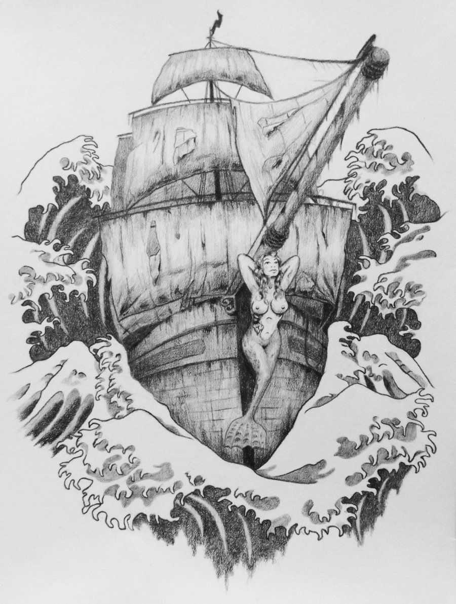 Графика. Это реалистичный рисунок корабля карандашом. Разумеется, имитируемый при помощи тату машинки;