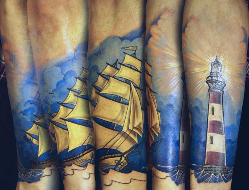 Еще одна классика жанра когда корабль плывет в закат. Рядом может быть флаг, или надпись о свободе, либо стремлении моряка попасть поскорее домой, к семье. Есть целая серия традиционны татуировок, характерных для русского, американского, или британского флота.