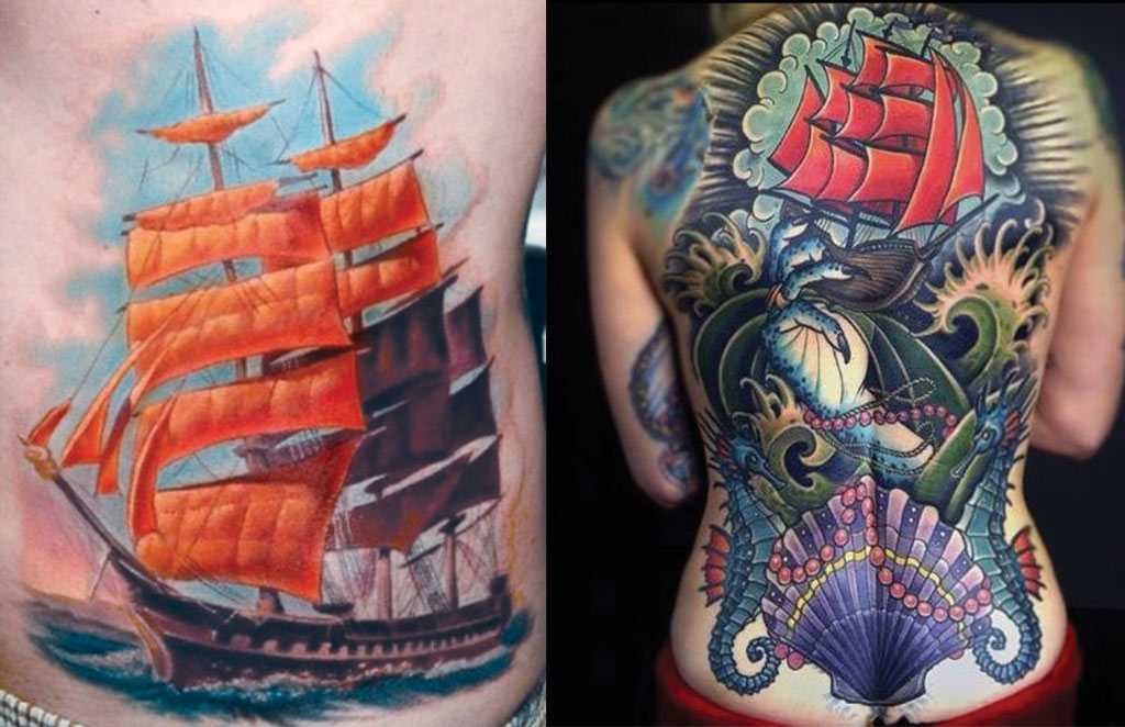 Порванные паруса корабля могут символизировать большую утрату, смерть близкого человека или события, которые оставили непоправимые последствия. Если корабль изображен с белыми парусами, это свидетельствует о достижении поставленной цели и строгом нраве обладателя тату. Присутствие пиратского флага характеризует такие качества человека, как страсть к авантюрам и экстремальным развлечениям. Паруса алого цвета олицетворяют романтичность, влюбленность и надежду.