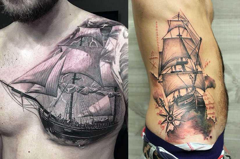 Тату парусник будет гармоничным дополнением образа человека, склонного к постоянной смене мест. Корабль символизирует стремление к совершенству. Парусник может наносится на любые части тела, но в верхней части туловища изображение смотрится лучше. Он может быть монохромным или цветным. Поскольку это преимущественно мужская тату, рисунок имеет достаточно большие размеры и отличается обилием элементов. Можно найти самые разнообразные эскизы тату парусников, часть из которых можно увидеть в нашей подборке в конце статьи.